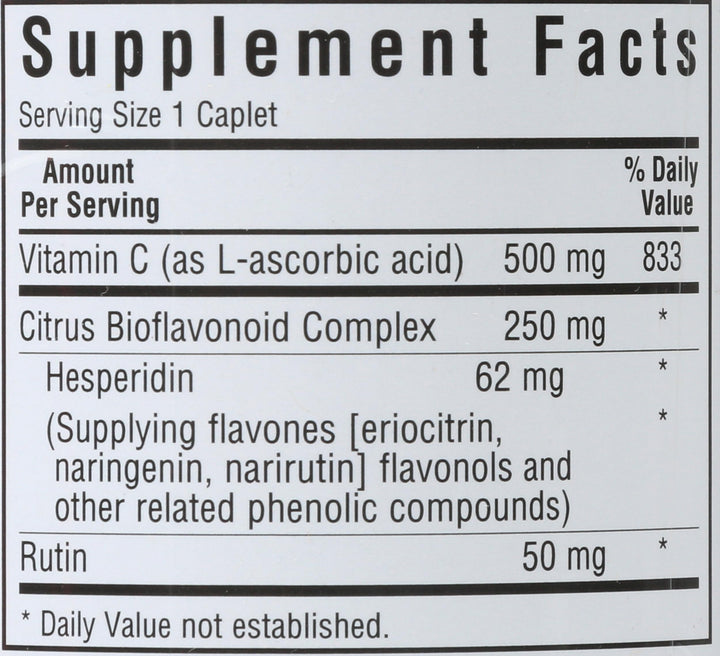 | ingredients | Vitamin C (L-Ascorbic Acid) Amount Per Serving : 500 mg %DV : 833 % , Citrus Bioflavonoid Complex Amount Per Serving : 250 mg %DV : * , Herperidin Amount Per Serving : 62 mg %DV : * , (Providing flavones eriocitrin, nargingenin, narirutin flavonols and other related phenotic compounds Amount Per Serving : %DV : , Rutin Amount Per Serving : 50 mg %DV : * , Other Ingredients: Calcium phosphate, vegetable cellulose, silica, stearic acid, vegetable magnesium stearate, vegetable glaze. |