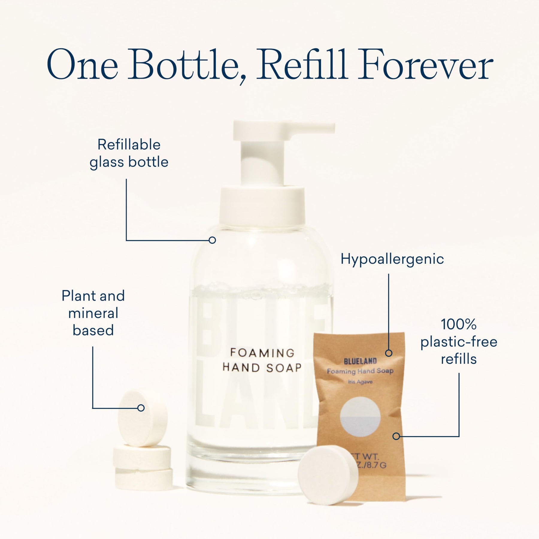 - Original Hand Wash – Hand Soap Starter Set - 1 Refillable Glass Foaming Hand Soap Dispenser + 4 Tablets Refills, Iris Agave Scent, Eco Friendly Hand Soap, Makes 4 x 9 Fl oz bottles (36 Fl oz total) by BLUELAND
