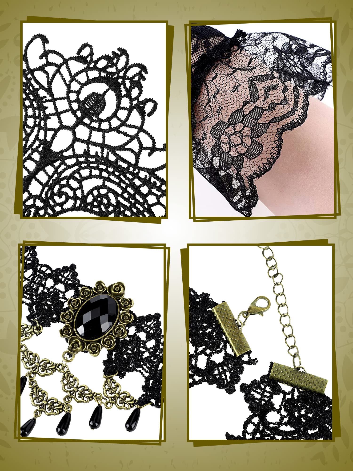 - Material: the masquerade mask and black lace gloves are made of delicate lace, the gothic necklace is made of lace, rhinestone and alloy, all the accessories have exquisite workmanship