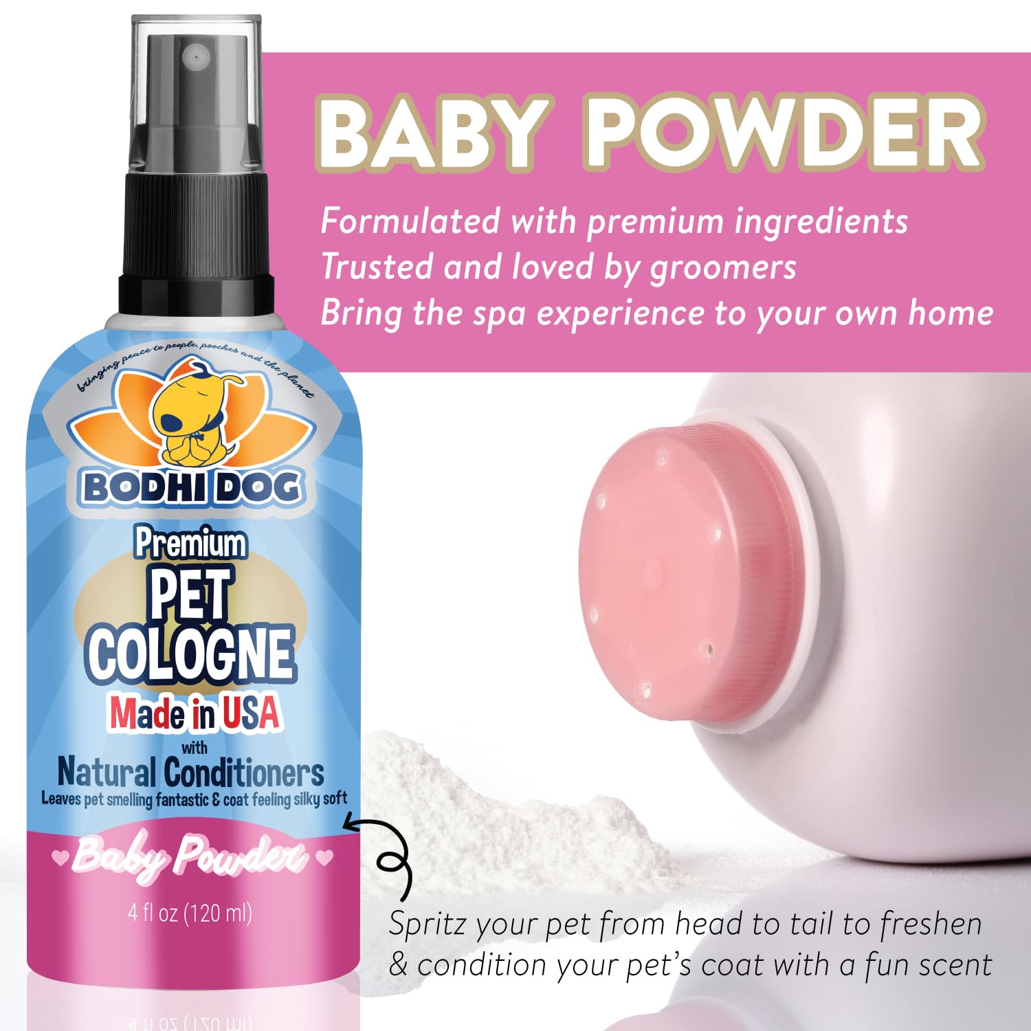 - Original Conditioners – Natural Dog Cologne (Baby Powder) - Premium Scented Deodorizing Pet Perfume with Conditioner for Dogs & Cats - Keeps Pets Fresh & Clean - Gentle and Safe Formula, Made in USA (4 Fl Oz) by Bodhi Dog