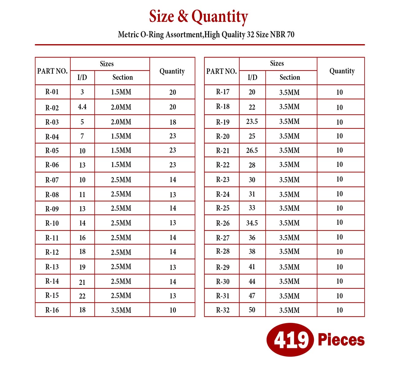 - This O-ring series contains 419 PCS metric standard rubber O-rings, with 32 sizes and models, which can be widely used in your car, plumbing, machinery, hydraulic and pneumatic maintenance.