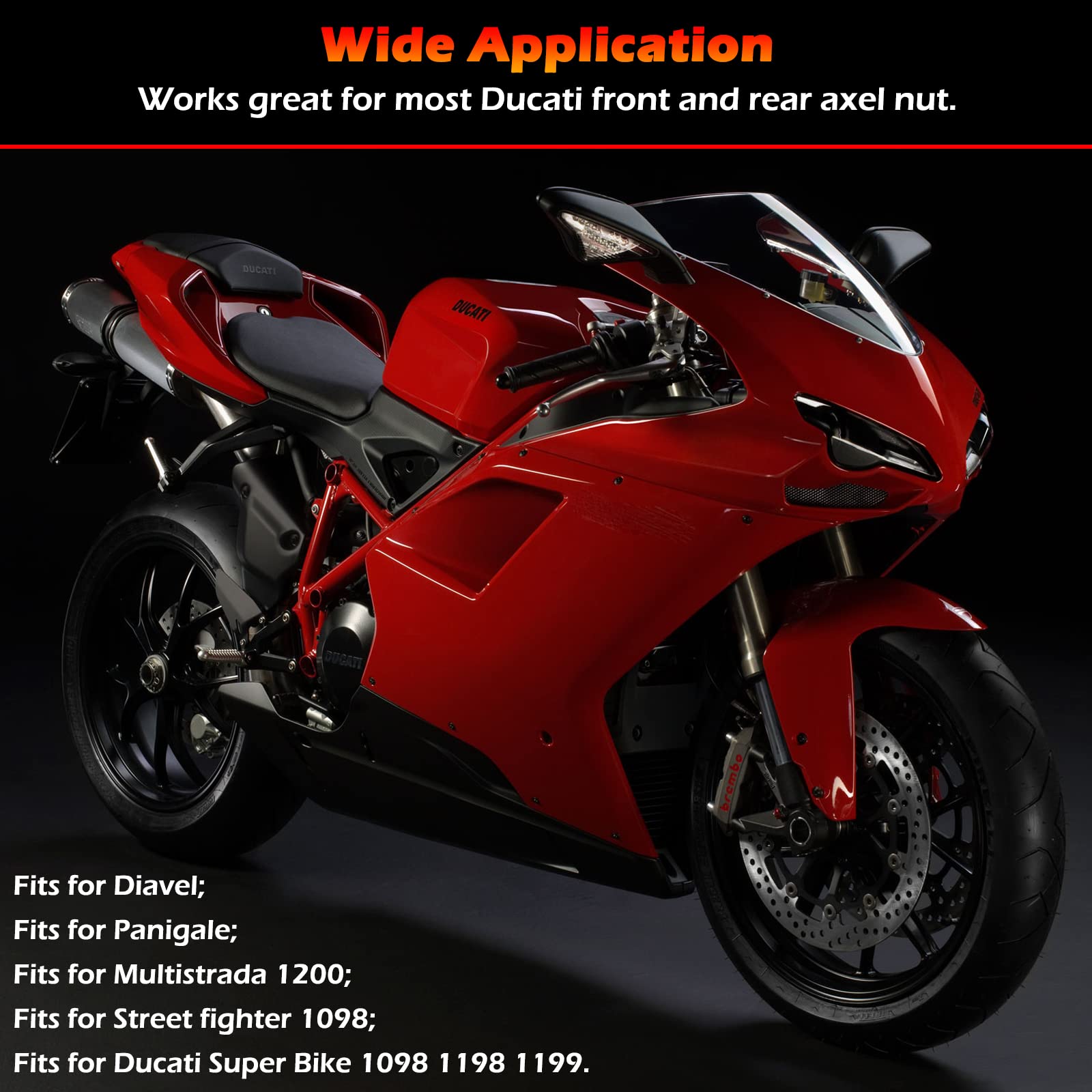 - Wide ApplicationsFits for Ducati Super Bike 1098 1198 1199; Fits for Panigale; Fits for Street fighter 1098; Fits for Multistrada 1200 M1200; Fits for Diavel. One socket tool for both the 30mm front & 55mm rear wheel nuts, an ideal tool to loosen and tighten the axle nuts of your front and rear axle.