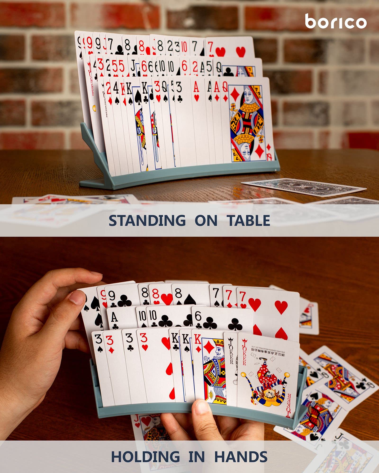 - STANDALONE WITH REMARKABLE STORAGE CAPACITY: BORICO Card Holder for Playing Cards can hold up to 35 cards simultaneously. You can either hold this Playing Card Holder in your hands or anchored it on your playing table, making it the best cardholder for any cards-playing addict, especially for people suffering with Arthritis.
