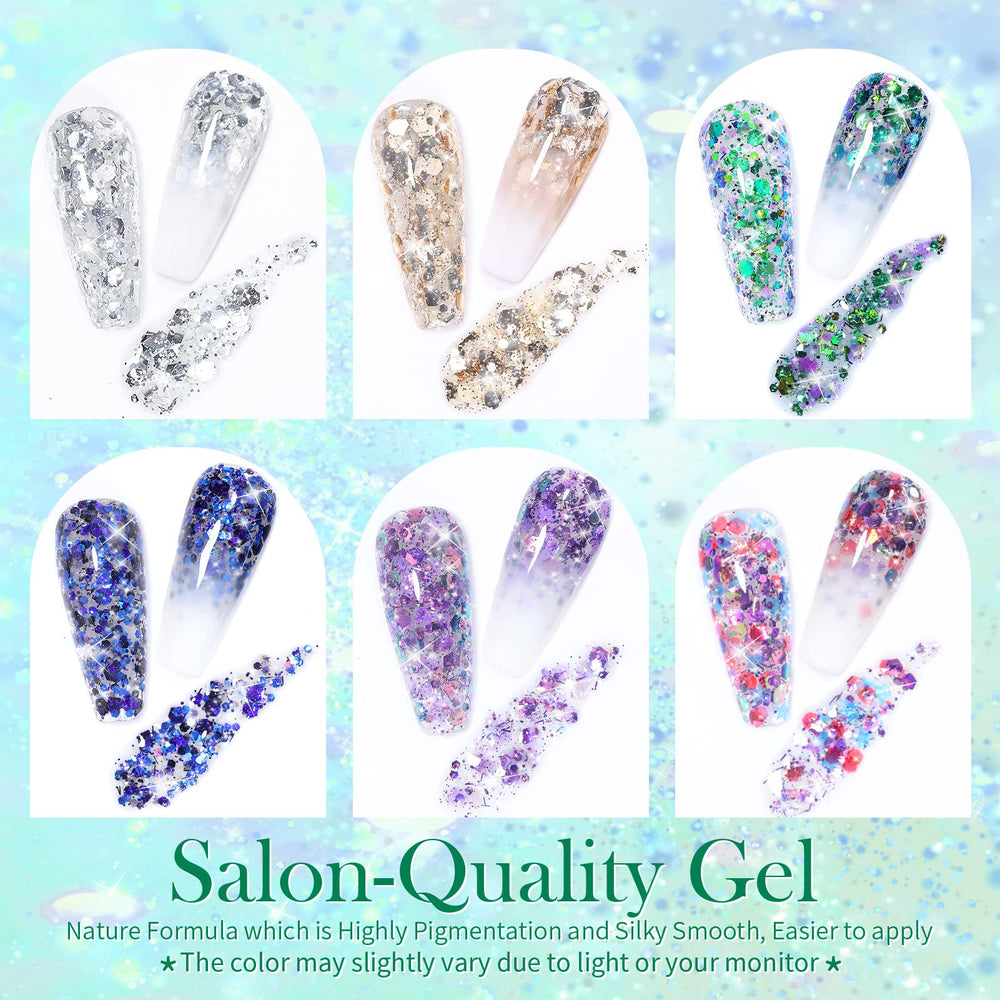 - Good Tenacity: The series of glitter gel nail polish set is long lasting for 21+ days with perfect shine under proper application - With base gel top coat under the full application process.High durability and intense pigmentation makes it stay last longer and brings you brilliant shine finish.