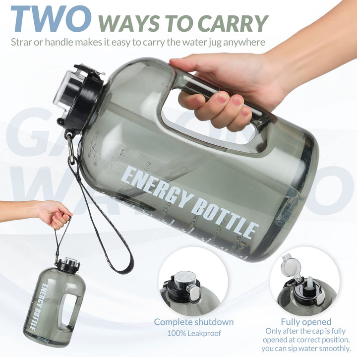 - The sport bottle has various capacity designs (50OZ/1.5L, 85OZ/2.5L, 1GAL/4.1L),which meets the bottom line of the water need of a healthy human life (with even just one bottle!).IT has a sturdy handle , a nylon braided strap, and a silicone gasket structure cover, a handle design, and ergonomics, which will give you a good feel when you hold it.