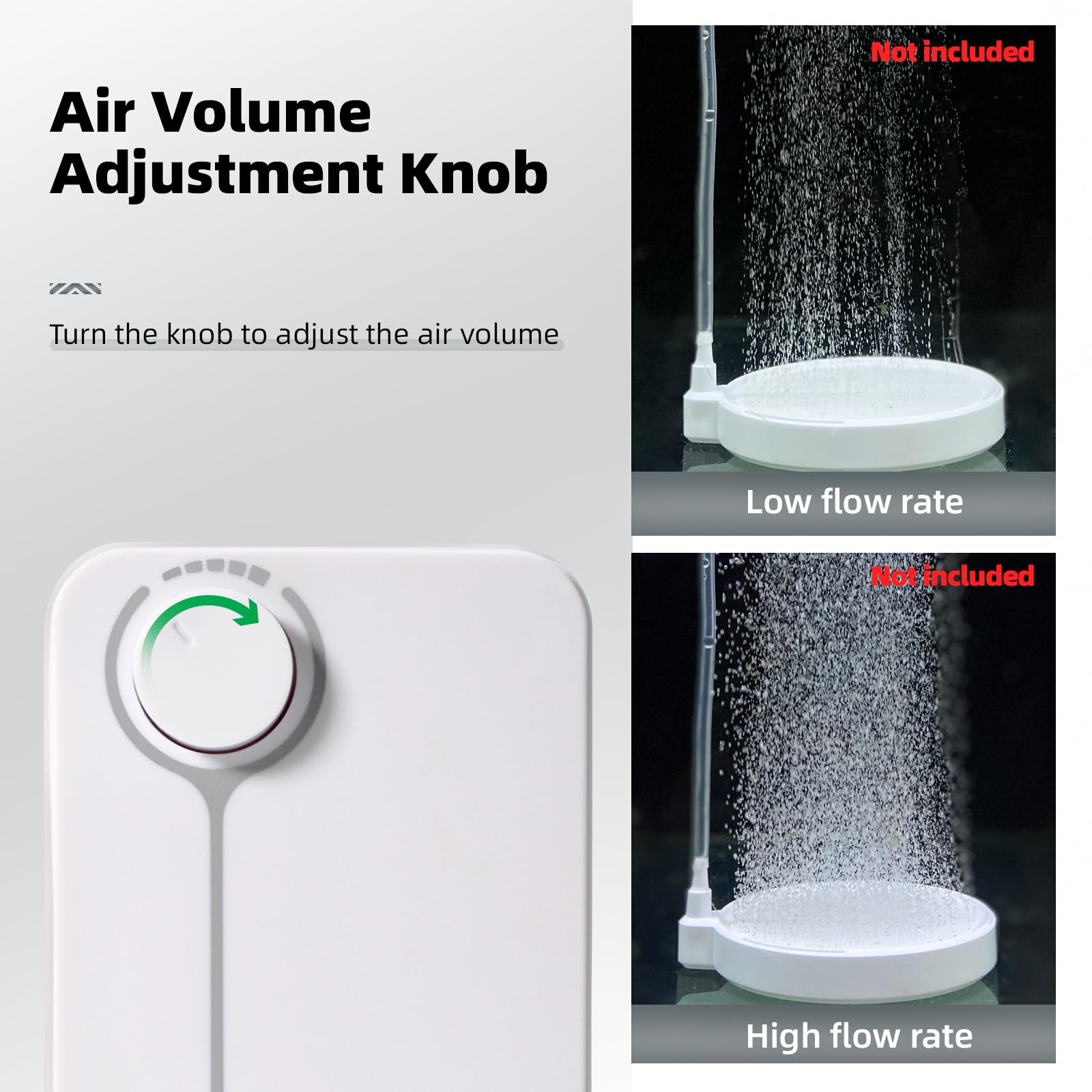 - : You can easily adjust the knob to customize the air volume to meet your specific needs. Feature silence, low vibration, and sufficient oxygen. Note: Air tubes and air stones are not included in the package.