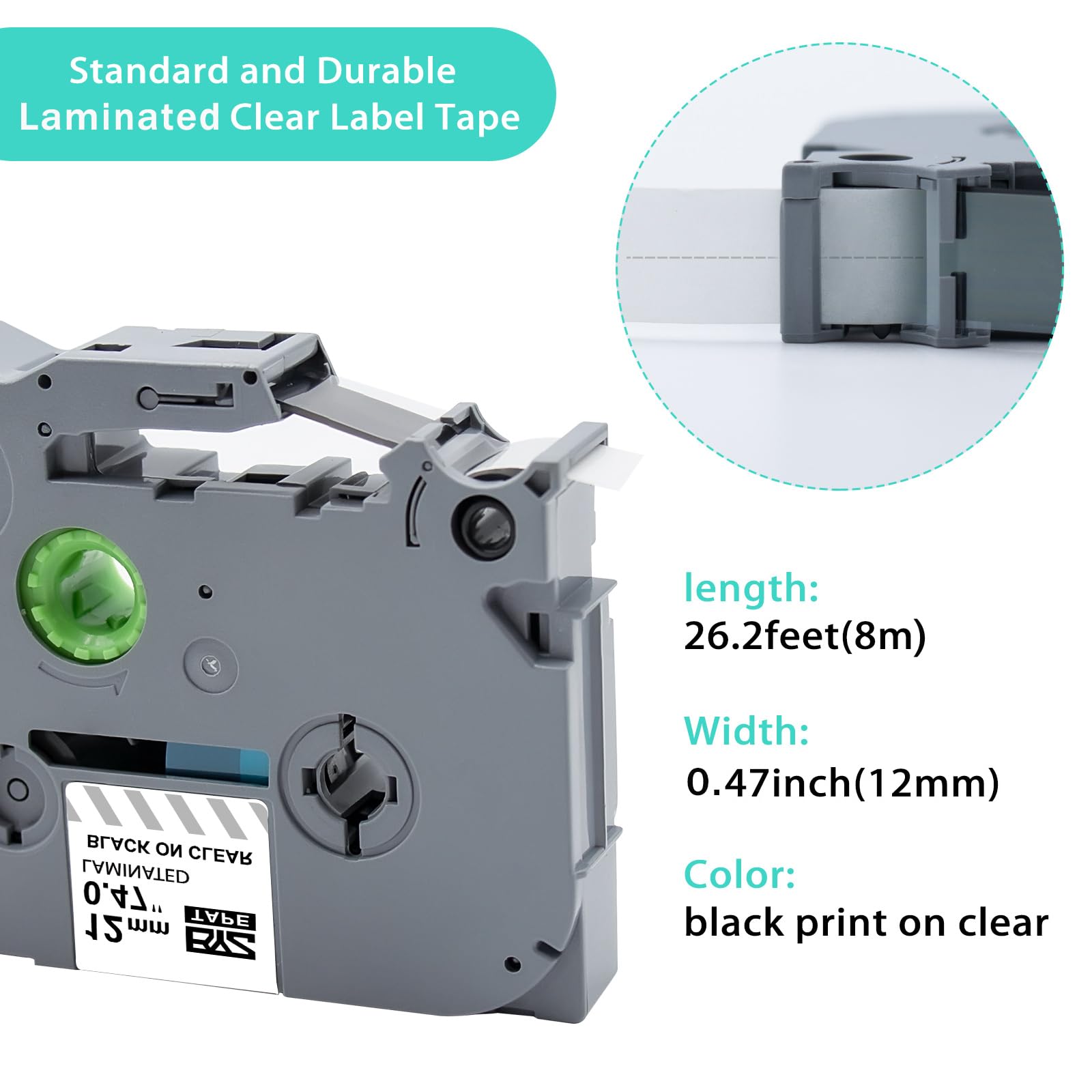 - Package Include: 5-pack label maker tape compatible with brother tze tz tape tze-131 12mm laminated clear. Color: Black print on Clear tape. Width: 1/2inch(12mm). Length: 26.2ft(8m).