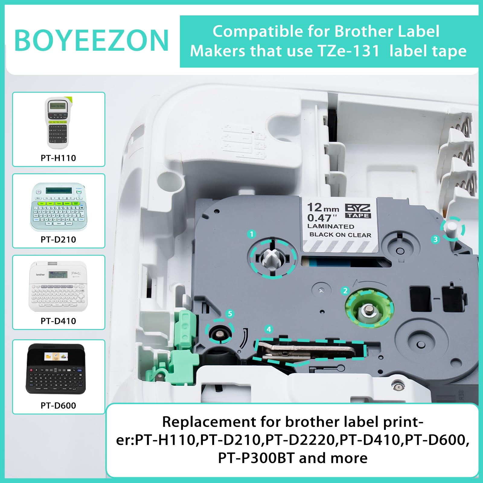 - Original Labeling Tapes – TZe/TZ Tape 12mm 0.47 Laminated Clear Replacement for Brother Ptouch TZe-131 Laminated Black on Clear Label Tape for Brother Label Maker PT-D210, PT-D220, PT-H110, PT-D400, 5-Pack by BOYEEZON