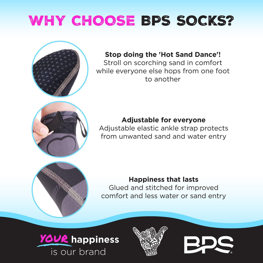 - BPS BEACH SOCKS ARE BETTER! Stop doing the hot sand dance and stroll in comfort while everyone else hops from one foot to another. Our neoprene socks flexible soles protect your feet from hot sand AND anything else you want to avoid like shells or rocks, and we’ve added adjustable elastic ankle straps to lessen unwanted water or sand entry.