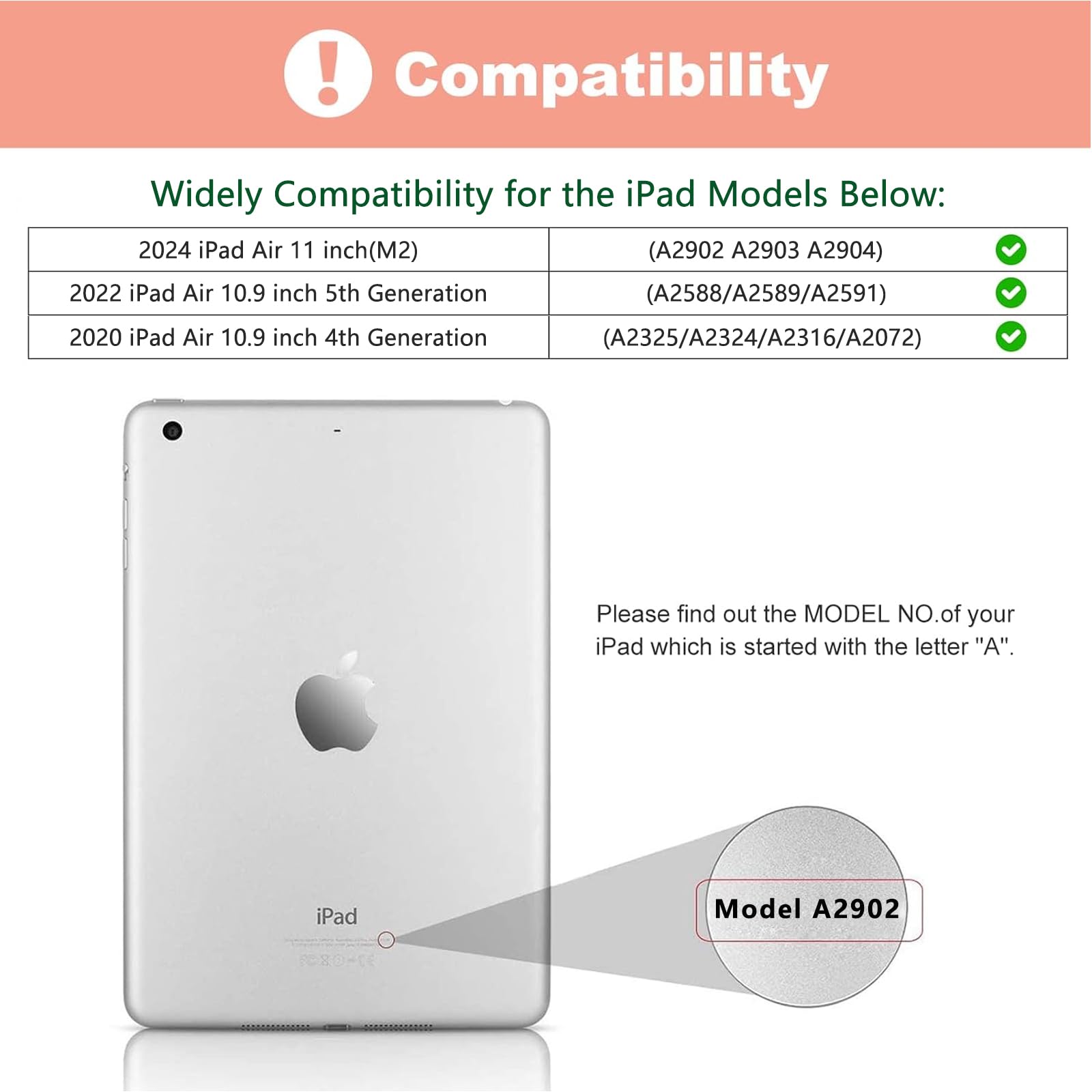 - Wide CompatibilityThis for iPad keyboard case is compatible with iPad air 11 inch(M2)2024 (A2902 A2903 A2904),compatible with iPad air 10.9 inch 5th gen 2022 (A2588 A2589 A2591), compatible with iPad air 10.9 inch 4th gen 2020(A2325 A2324 A2316 A2072), compatible with iPad pro 11 inch 1st gen 2018(A1980/A1934/A1979/A2013). Please check your iPad model before purchasing.