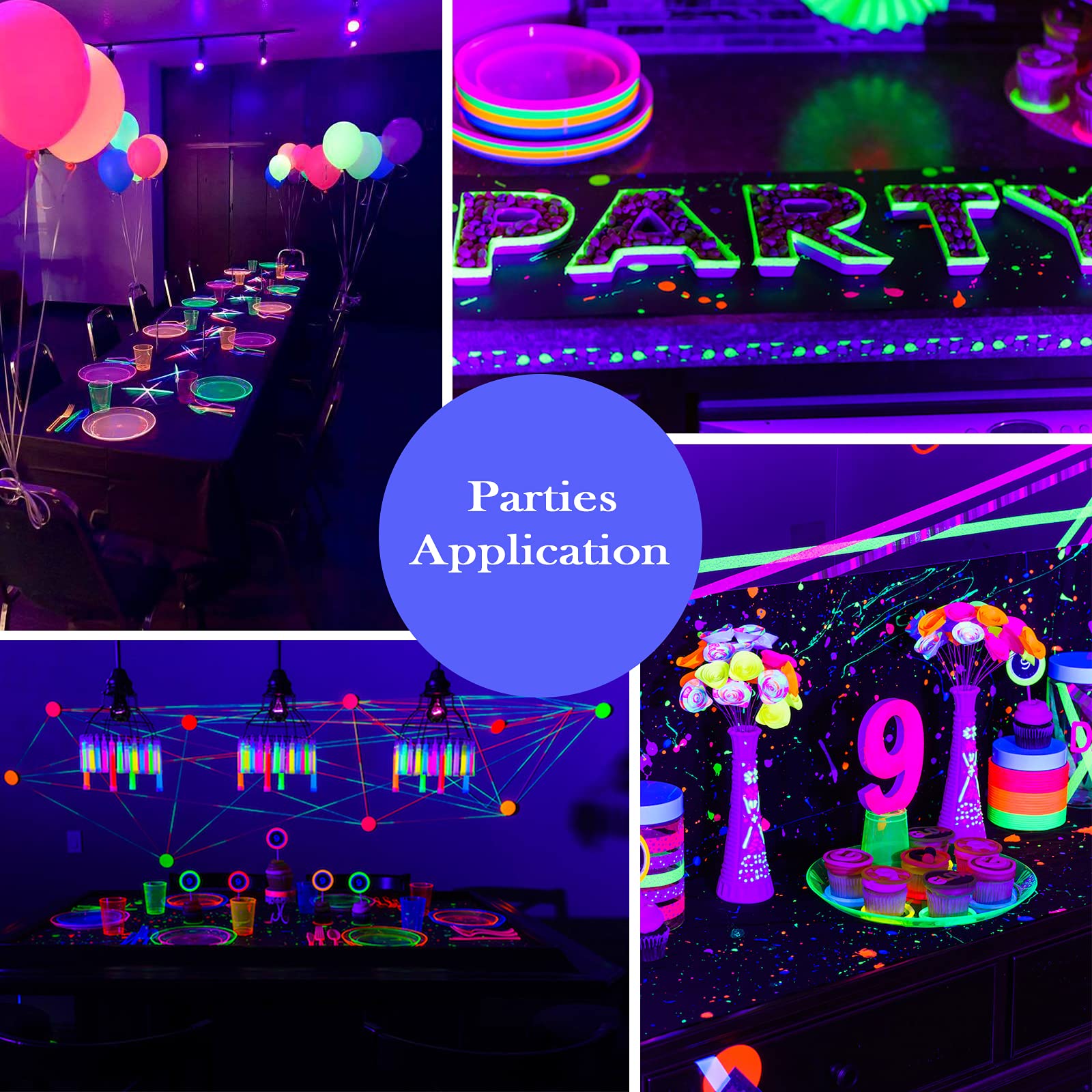 - Blacklight bulb of wide applications: Glows in the dark, used to illuminate most reactive pigments, body painting and fluorescent posters, neon-colored objects. Perfect for room decoration, clubs, bars, paintings, bedrooms, game rooms, porches, basements, aquariums, celebrations, photography, body art, glow-in-the-dark parties and more.