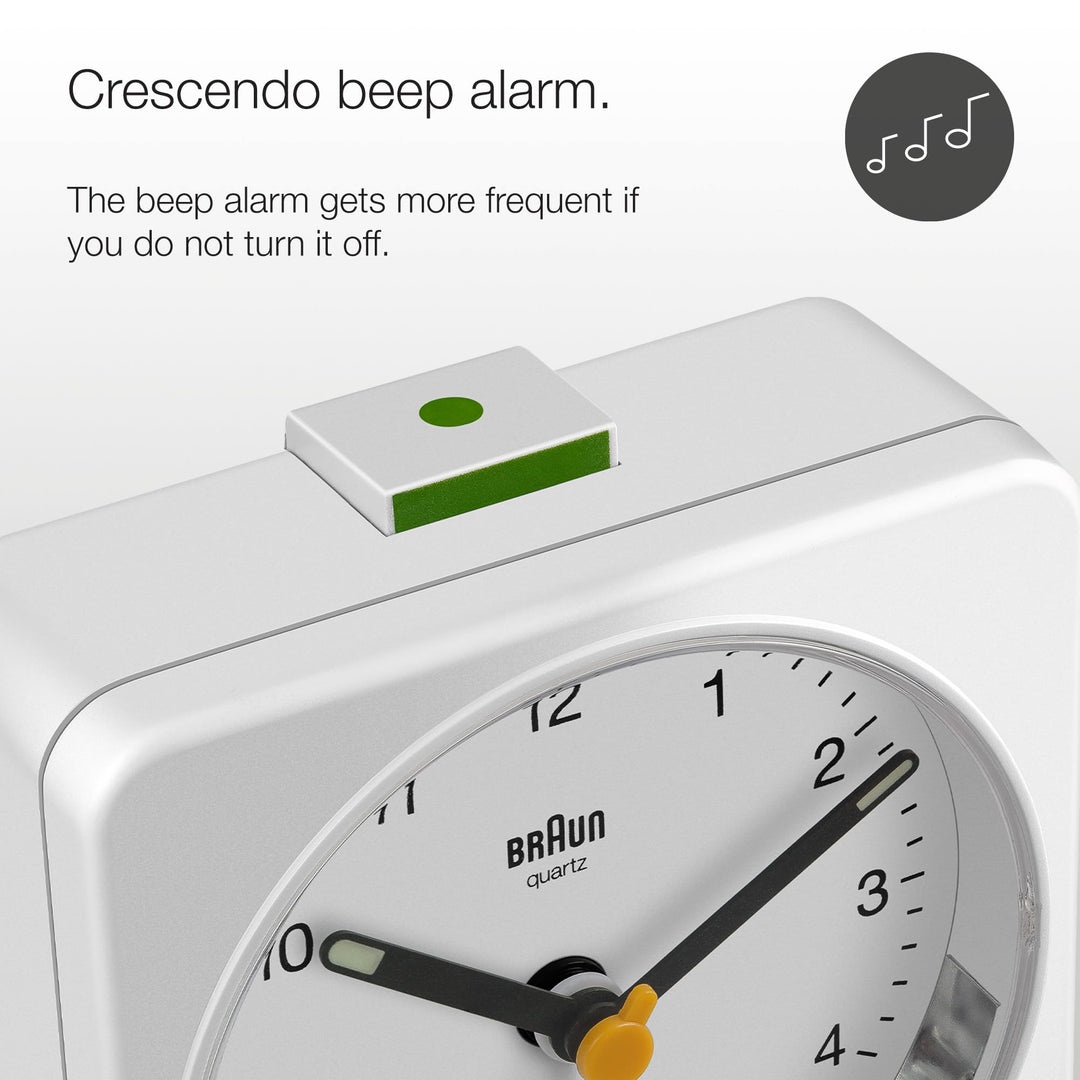 - Original Alarm Clocks – Classic Analogue Alarm Clock with Snooze and Light, Quiet Quartz Sweeping Movement, Crescendo Beep Alarm in White, Model BC03W. by Braun