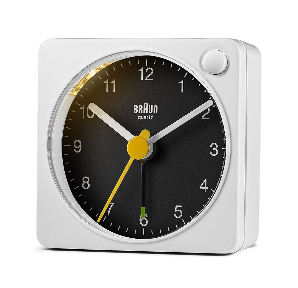 - Original Alarm Clocks – Classic Travel Analogue Alarm Clock with Snooze and Light, Compact Size, Quiet Quartz Movement, Crescendo Beep Alarm in White and Black, Model BC02XWB. by Braun
