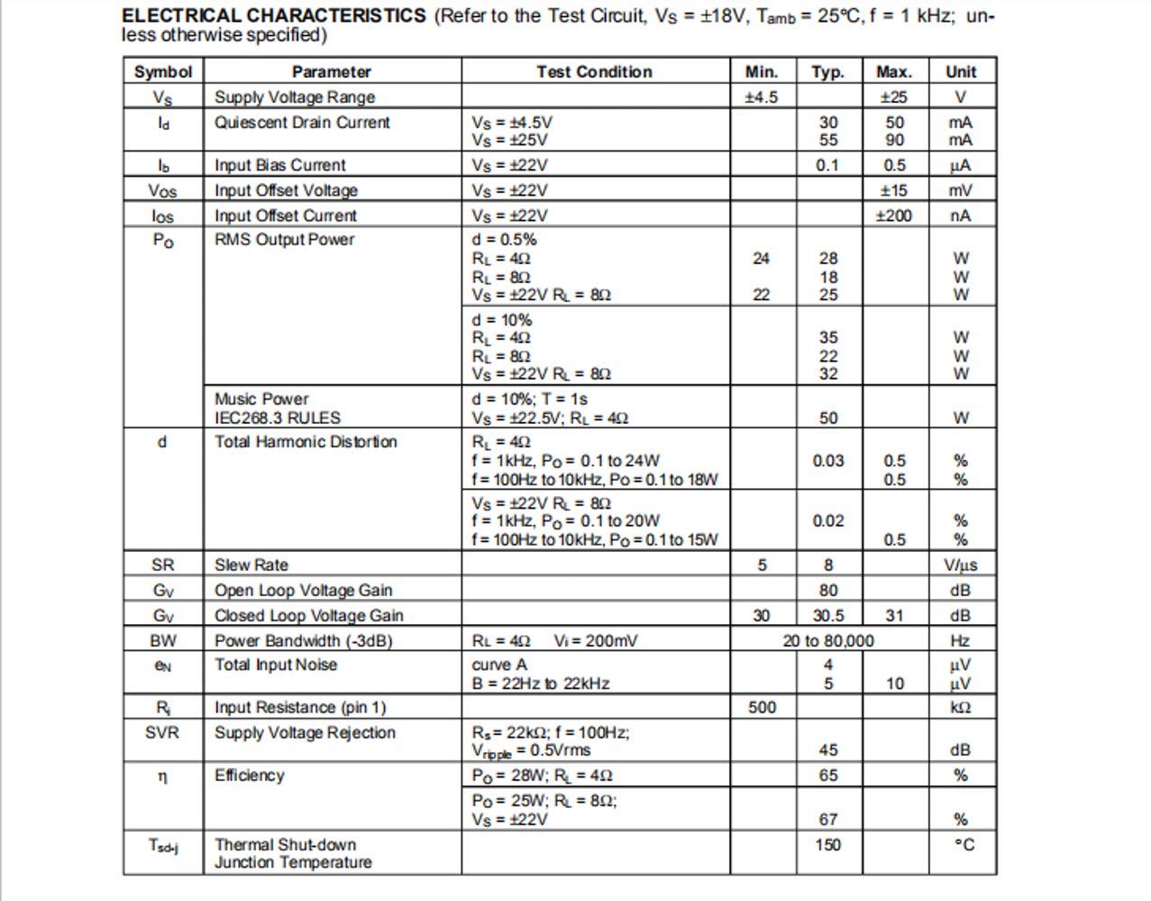 Moreover, the TDA 2050 delivers typically 50W music power into 4 ohm load over 1 sec at VS= 22.5V, f = 1KHz.