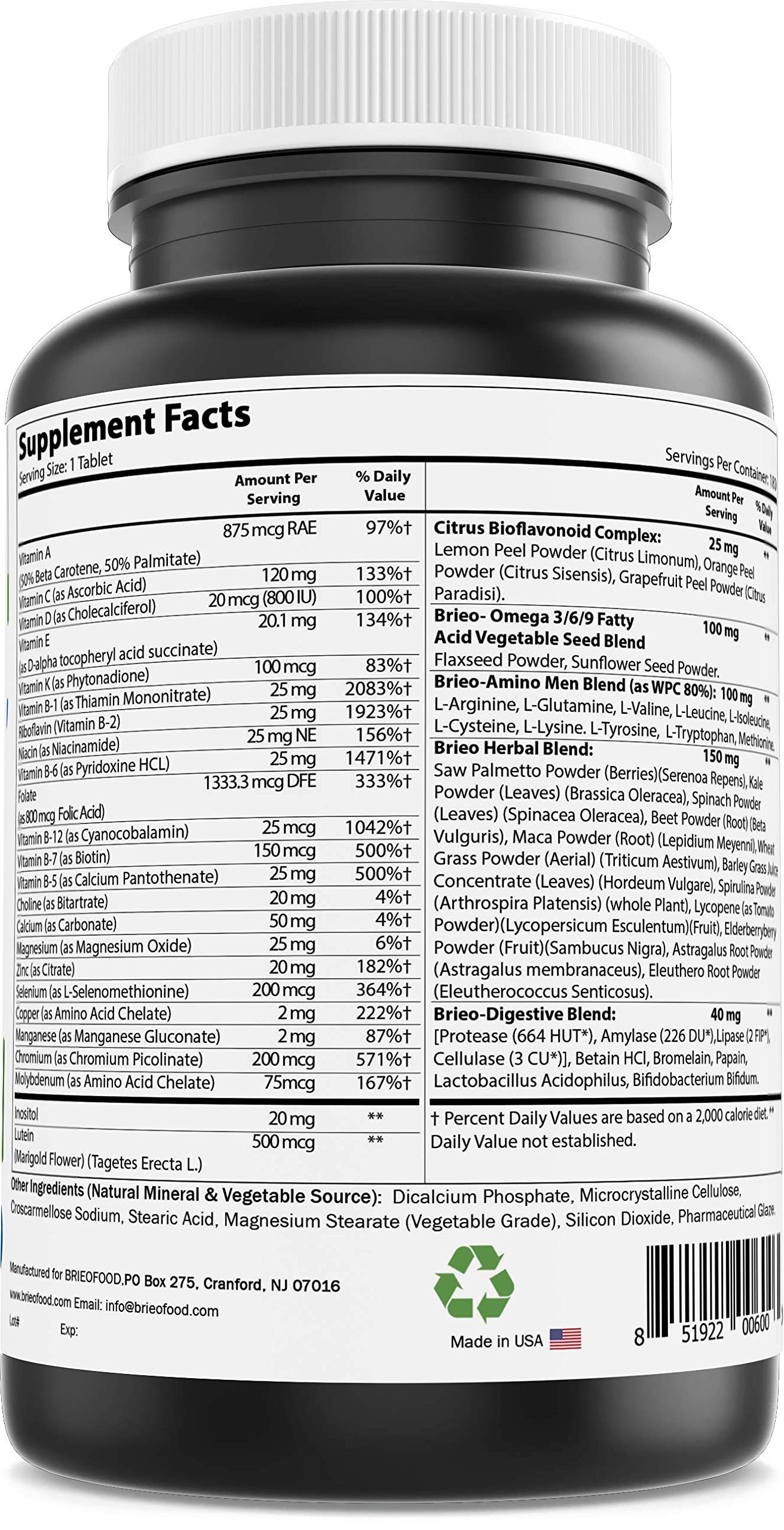 | ingredients | Vitamin A, Vitamin C, Vitamin D, Vitamin E, Vitamin K, Vitamin B1, Riboflavin, Niacin, Vitamin B-6, Folic acid, Vitamin B-12, Biotin, Vitamin B-5, Calcium, Magnesium, Zinc, Selenium, Copper, Manganese, Chromium, Molybdenum, Choline, Inositol, Lutein, Citrus Bioflavonoid Complex: (from Lemon, Orange, Grapefruit) providing: Hesperidin, Naringin, Flavonols, Flavones, Brio-Omega 3/6/9 Fatty Acid Vegetable Seed Blend: Flax Seed Powder (dry, cold pressed), Sunflower Seed Powder (dry, cold pressed), Brio-Amino Men Blend: L-Arginine, L-Glutamine, L-Valine, L-Leucine, L-Isoleucine, L-Cystine, L-Lysine, L-Tyrosine, L-Tryptophane, Methionine, Brio-Vegetable Complex: Kale, Spinach, Dandelion Greens, Beet, Broccoli, Maca, Acai, Wheat Grass, Barley Grass, Brio-Herbal Blend: Prostate Support Blend: Saw Palmetto berry, Organic Spirulina, Lycopene ( From Tomato), Stress/Energy Support Blend: Schizandra (bery), Maca (root), Chamomile (flower), Immune Support Blend: Elderberry (berry), Astragalus (root), Eleuthero (root), Brio-Digestive Enzyme Blend: Concentrated Enzyme Formula Protease (664 HUT*), Amylase (226 DU*), Lipase (2 FIP*), Cellulase (3 CU*), Betain HCl, Bromelain, Papain, Brio-Probiotics: L. acidophilus, B. Bifidum, Microcrystalline Cellulose, Vegetable Stearate, Modified Cellulose, Silica, Food Glaze. |