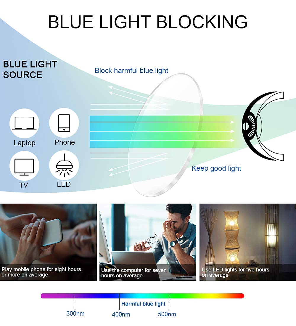 - BLUE LIGHT FILTER GLASSES - Blue Light Blocking Glasses protects your eyes by filtering out 95% of the most harmful High Energy Blue Light rays while letting through the less harmful portion of the blue light spectrum, reduce discomfort from vedio, tv, phone, laptop, pc gaming and working under fluorescent lights. Protects your eyes, help you anti glare, headache, eye strain, dry eye and sleep better.