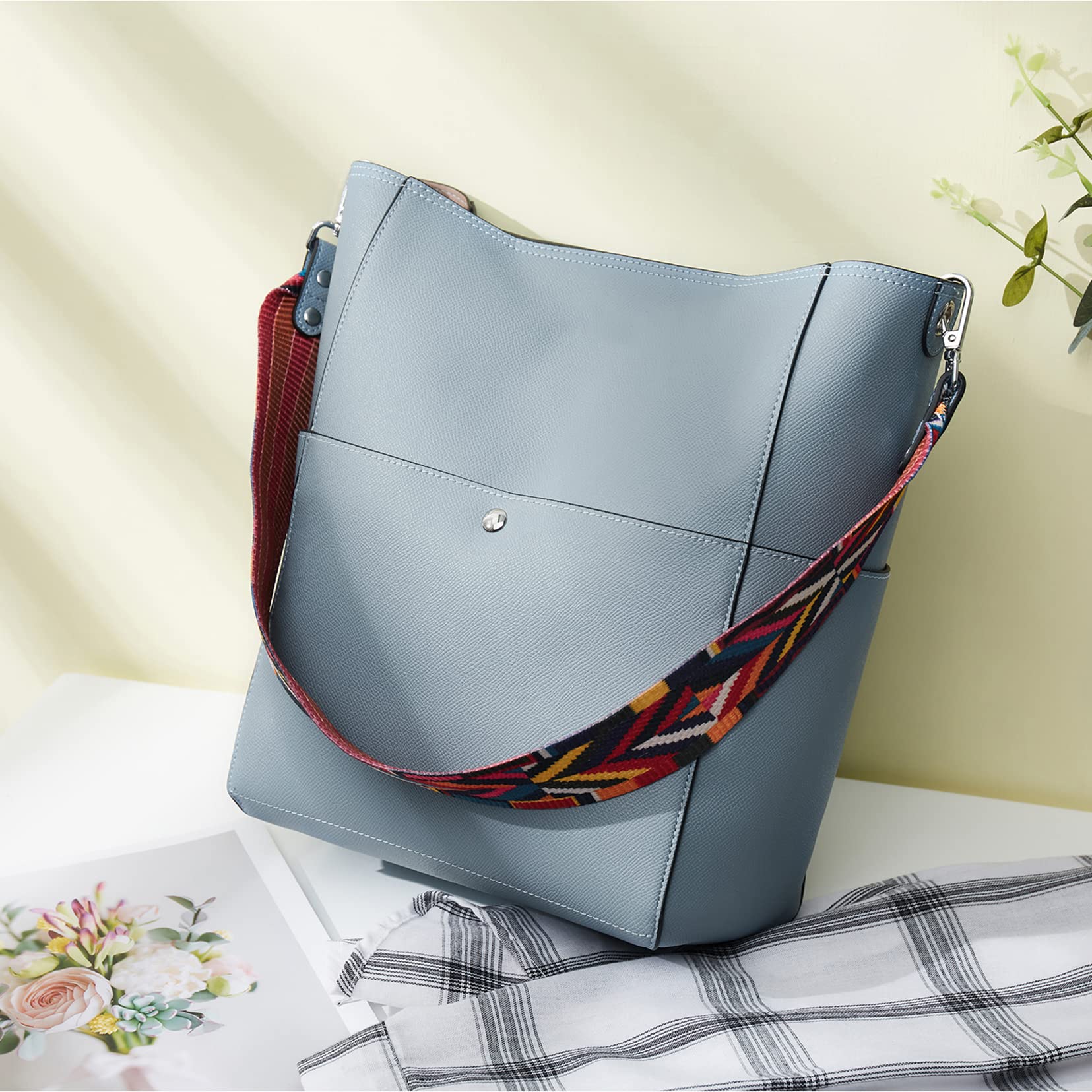 - Unique Shoulder Strap Design: In order to make your feminine charm display more perfect, this fashionable bucket bag is designed with a unique style woven shoulder strap and a pure vegan leather strap. The handle drop of the woven shoulder strap is 11.61, enough to reach your shoulder. The shoulder bags strap (49.5 inches) allows you to adjust it at will. It can be used as a crossbody bag/shoulder purse/handbags.