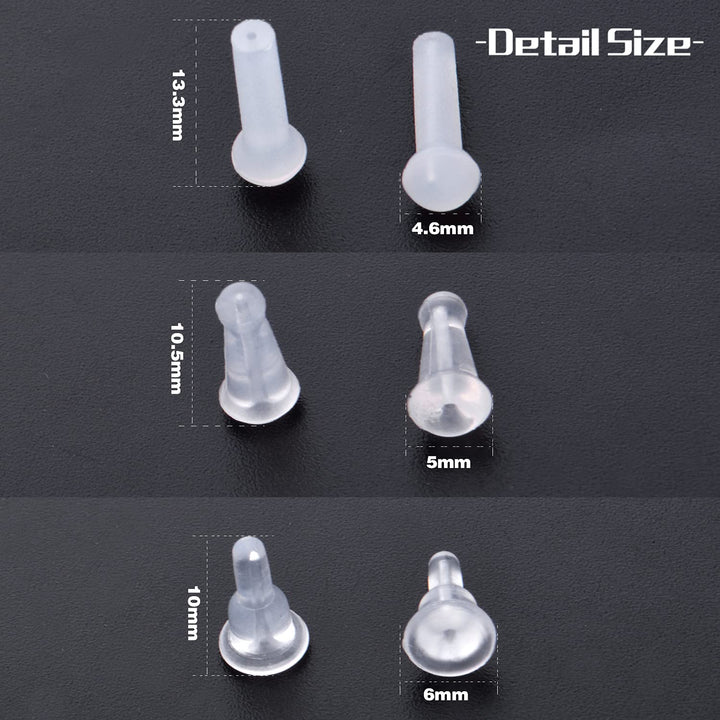 - Multiple sizes: As the picture shows, 3 sizes, 13.3mm*4.6mm; 10.5mm*5mm; 10mm*6mm. The suitable size of the rubber earring backs fits for most earrings posts. Please refer to the picture for the specific size.