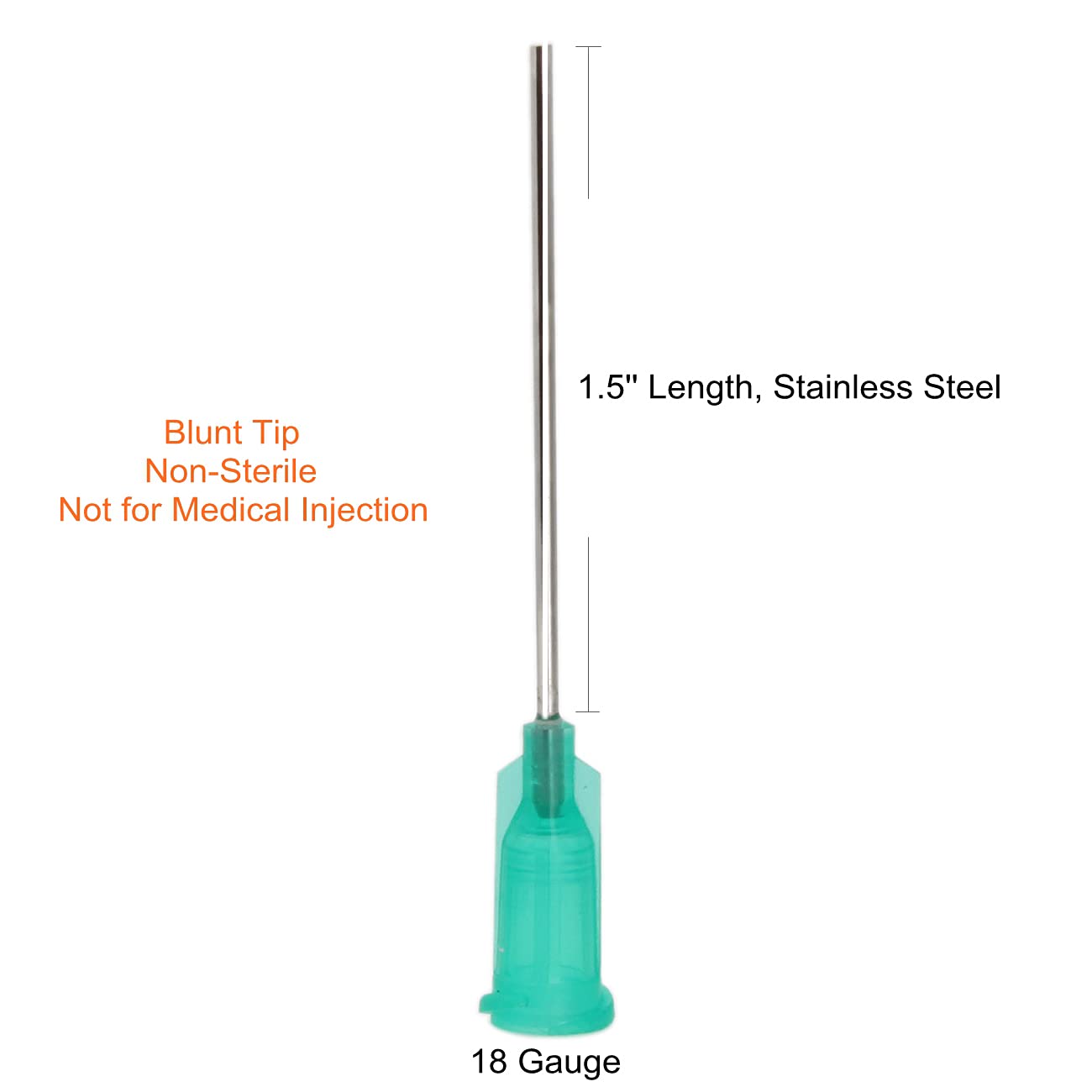 - 1.5'' LUER LOCK NEEDLES x 12 - 14 Gauge x 6, 18 Gauge x 6, flat tip needle large and long enough for most use cases.