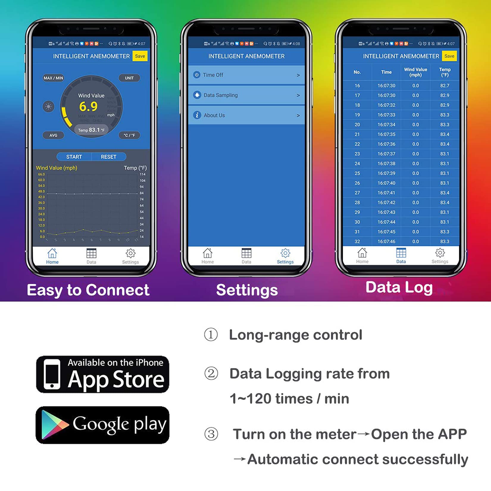 Control anemometer and export & store data on your phone by connecting to phone software through bluetooth.