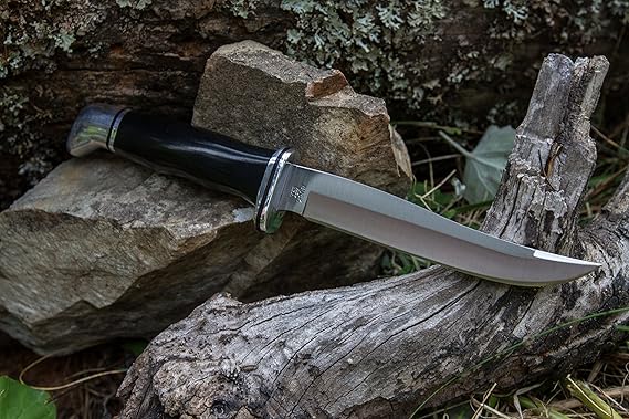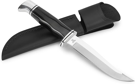 Classic, all-purpose, heavy-duty. Features including full tang construction, a finger guard integrated into the blade, thumb grip ridges and a deep choil help make this knife one of the best options for the serious hunter. Overall length: 9 1/8" (23.2 cm). Imported Sheath.