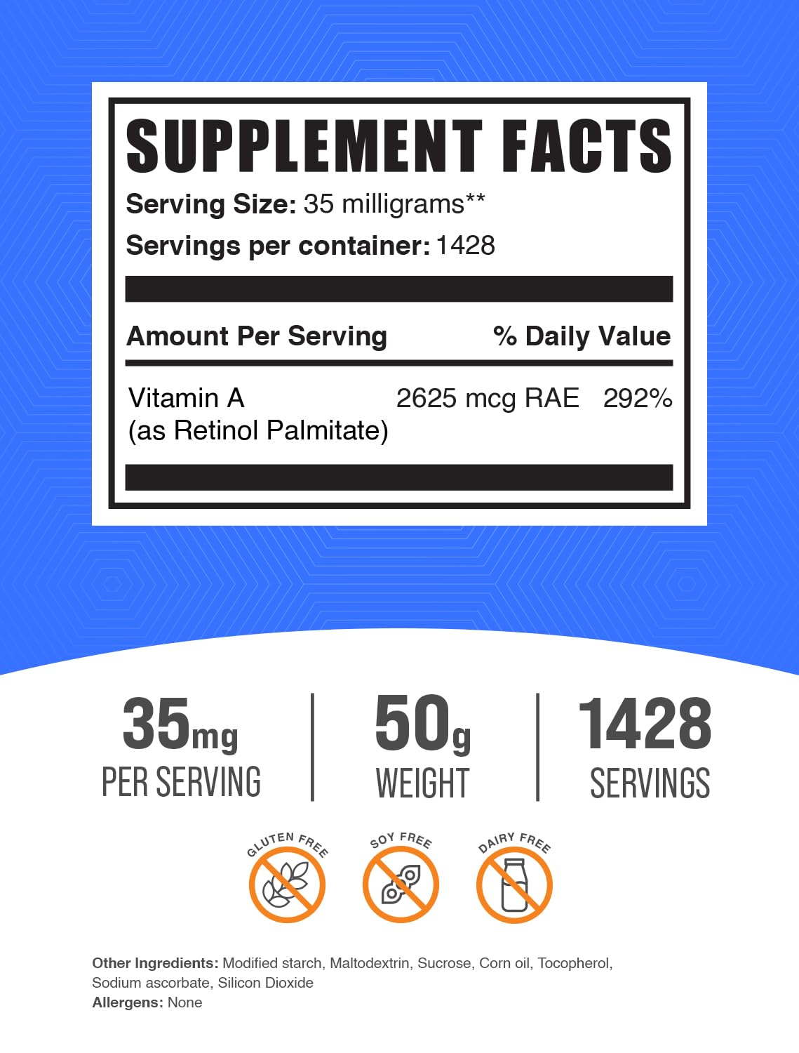 - Original Vitamin A – .com Vitamin A Palmitate Powder - as Retinol Palmitate, Vitamin A Supplement for Immune & Eye Support - Gluten Free, 35mg per Serving, 50g (1.8 oz) (Pack of 1) by BulkSupplements