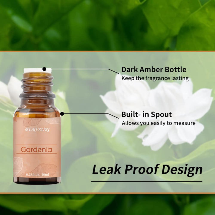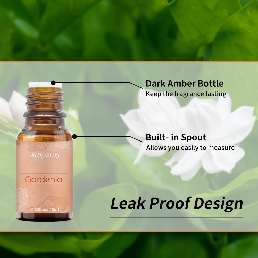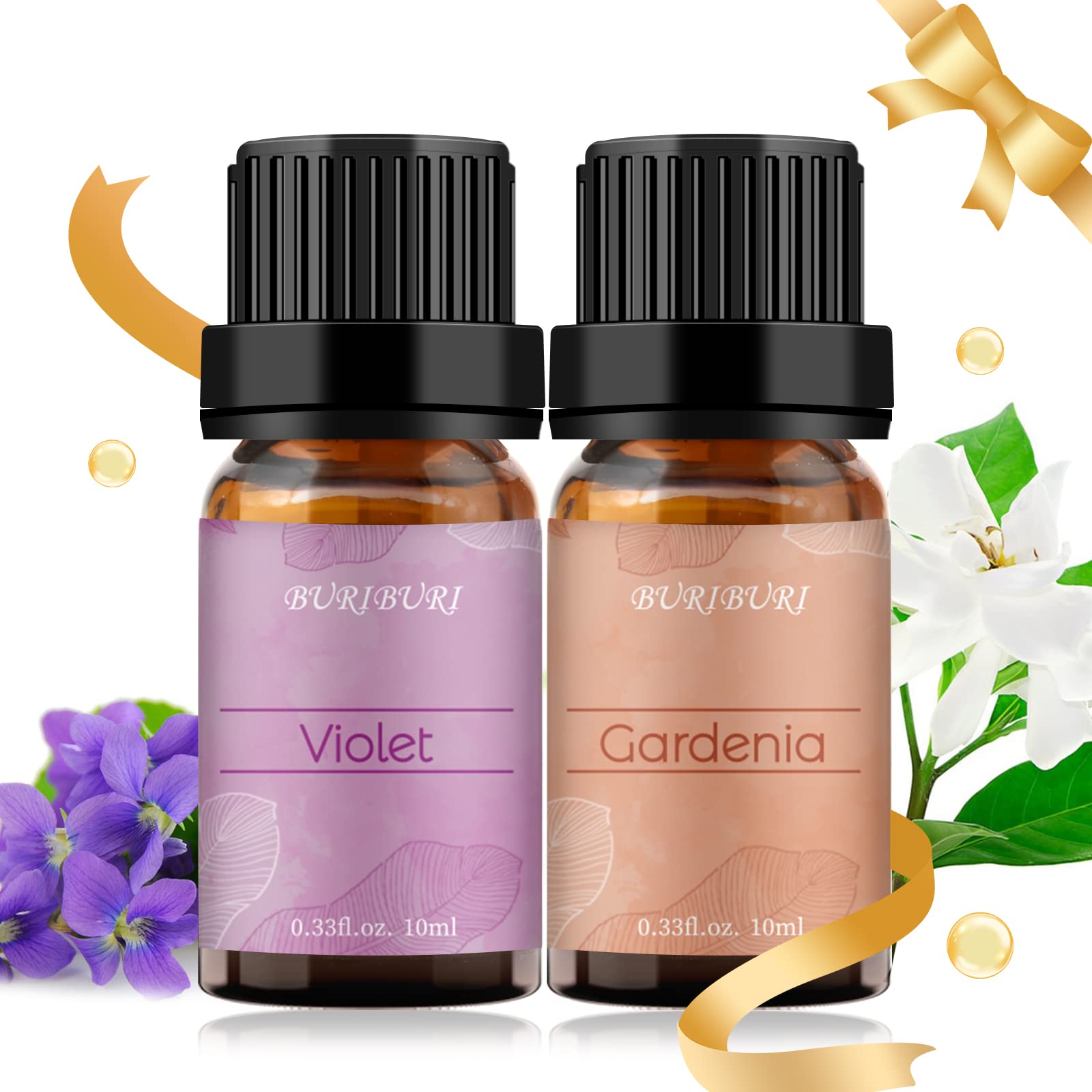 - Packing Includes: 10ml Gardenia Essential Oil x1, 10ml Violet Essential Oil x1. With no adulterants or dilution, 100% pure quality. BURIBURI scented oil is bottled in a durable amber glass bottle.