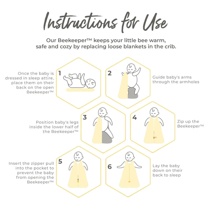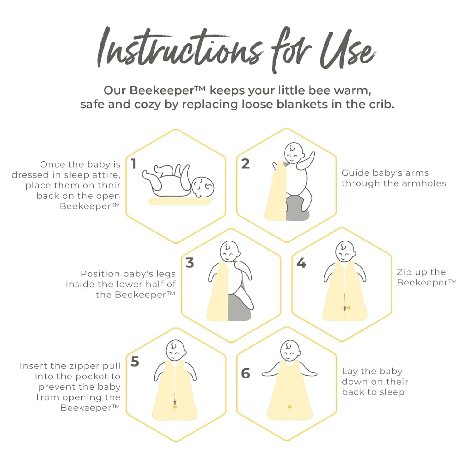- Easy to Use and Wash: This baby beekeeper's zipper closure makes it easy to use. The zipper opens from the bottom for easy late-night diaper changes. These beekeepers are also easy to care for. Cold machine wash under a gentle cycle. Then tumble dry low.