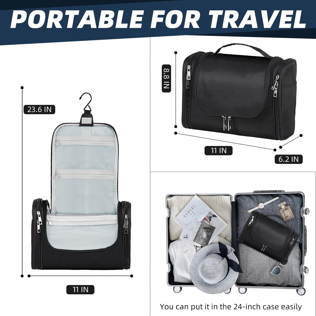 - Large Capacity and Ultra-Durable Zippers : Large travel hanging toiletry bag size: 11x 6.2 x 8.8, has ample space for long-days trips or family vacation toiletries as shampoo, shower gel, toothpaste, toothbrushes, makeups, shaving accessories, towels, etc, make storage easier, convenient and organized.Our travel bags feature rigorously tested ultra-durable zippers, ensuring your belongings stay safe and sound.
