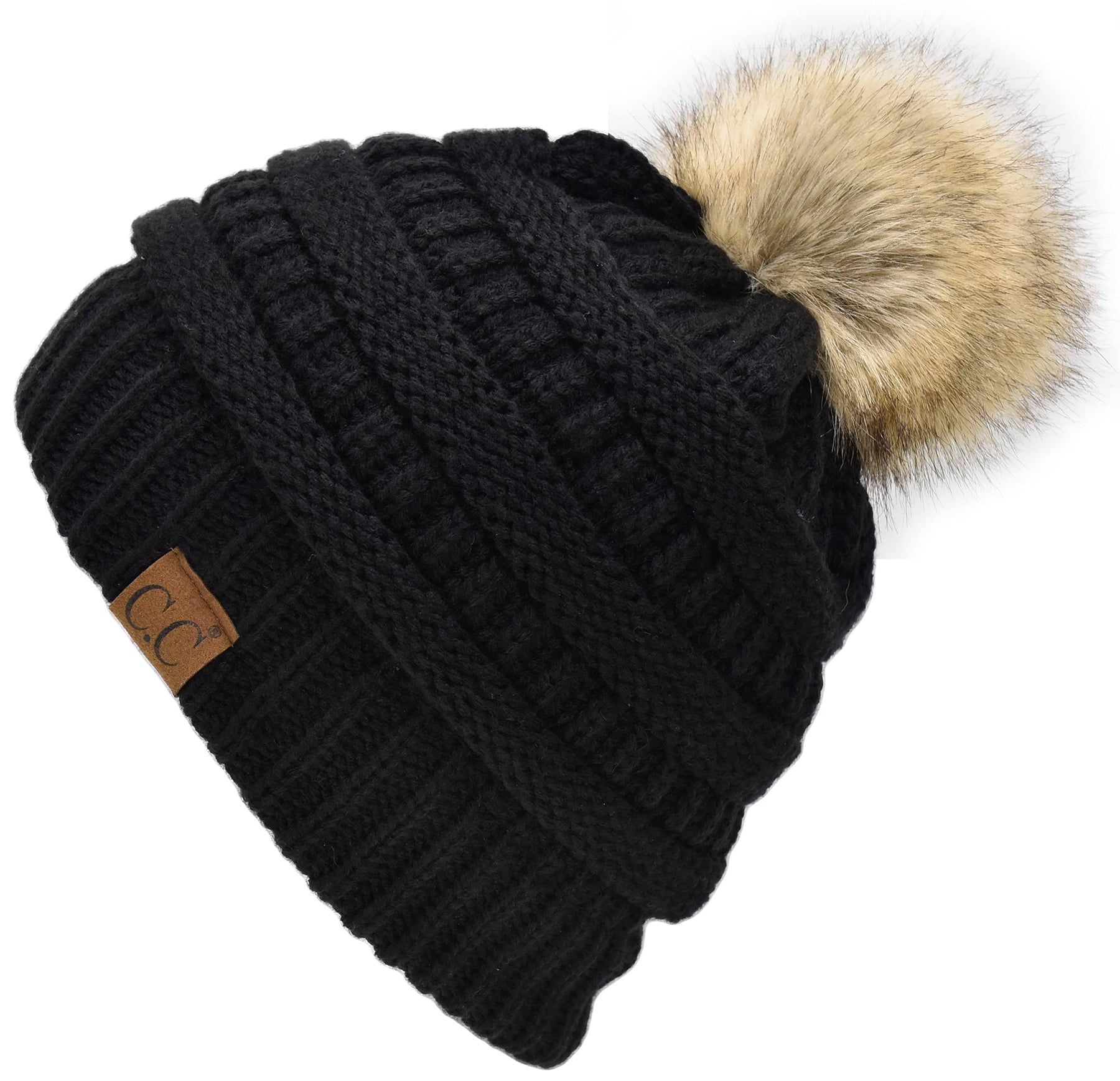 - Original Skullies & Beanies – Trendy Fuzzy Sherpa Fleece Lined Warm Soft Stretch Cable Knit Faux Fur Pom Pom Skull Cap Cuff Beanie Hat, Black by C.C