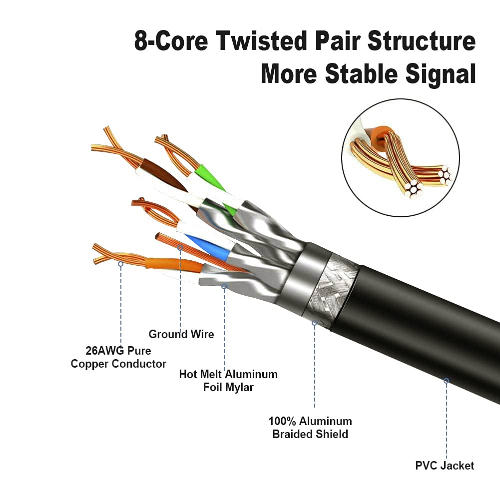 - Double Shielded: Overall aluminum foil shield and braided shield structure allow the cat8 Ethernet cable high anti-interference and less signal attenuation. Protect against EMI/RFI interference, improved quality in twisting of the wires provides better protection from crosstalk, noise, and interference that can degrade the signal quality.