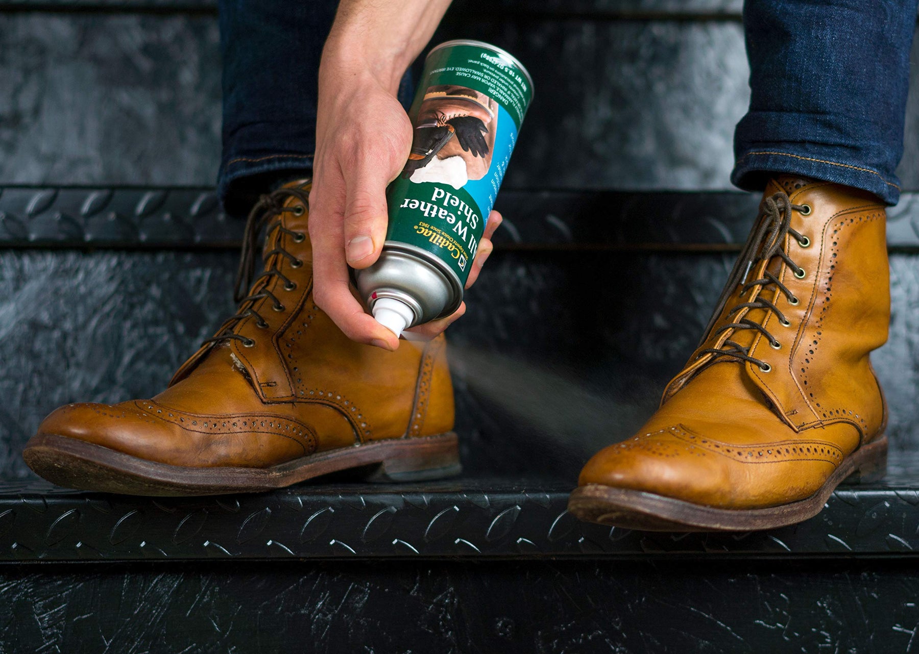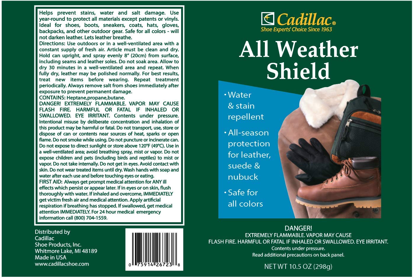 - WATERPROOF YOUR SHOES: Keep your shoes cleaner and drier with Cadillac All Weather Shield waterproof spray! Protect suede, fabric, nubuck, leather, nylon, polyester, canvas, and synthetics. No matter the material, Shield will keep you protected from rain, snow, puddles, and any other water damage.