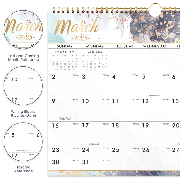 - CONVENIENCE DESIGNS - Sturdy twin-wire binding for turning pages easily and Hanging hook for hanging calendar in your office or home, besides, this 2025 wall calendar is designed with various unique patterns for each month, which can bring you a good visual enjoyment.