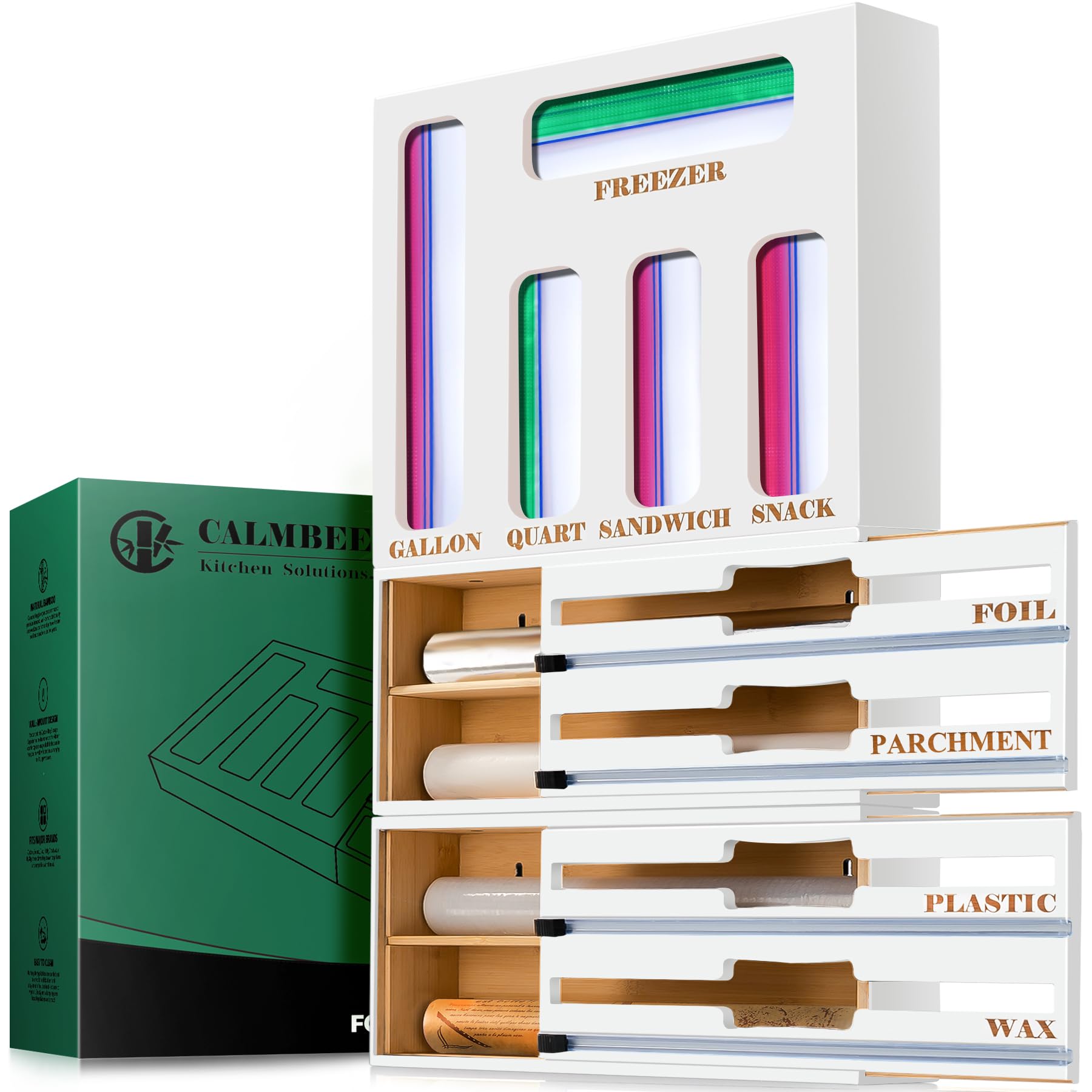 - The ONLY Complete Kitchen Baggie and Foil Dispenser: Calmbee baggie organizer and foil dispenser is the only complete set that can effortlessly organize your kitchen. This set contains 4 in 1 wrap dispenser with cutter, perfect for Aluminum foil, plastic wrap, wax paper. It also comes with 5 in 1 ziplock storage bag organizer, compatible with Ziploc, Solimo, Hefty, Glad, Up&Up & GreatValue storage, freezer and slider bag of sandwich, quart, snack and gallon size.