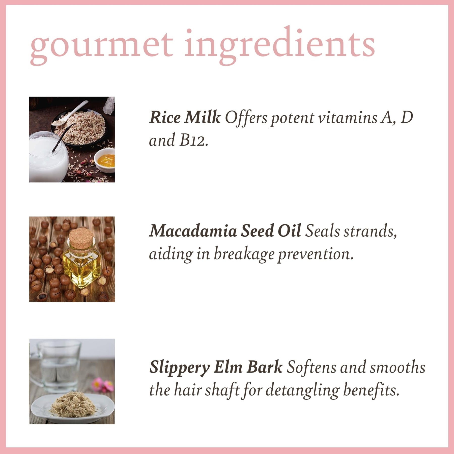 - NOURISH – Crafted with a blend of rice milk and macadamia nut oil to prevent hair breakage and promote healthy hair growth with a light vanilla aroma