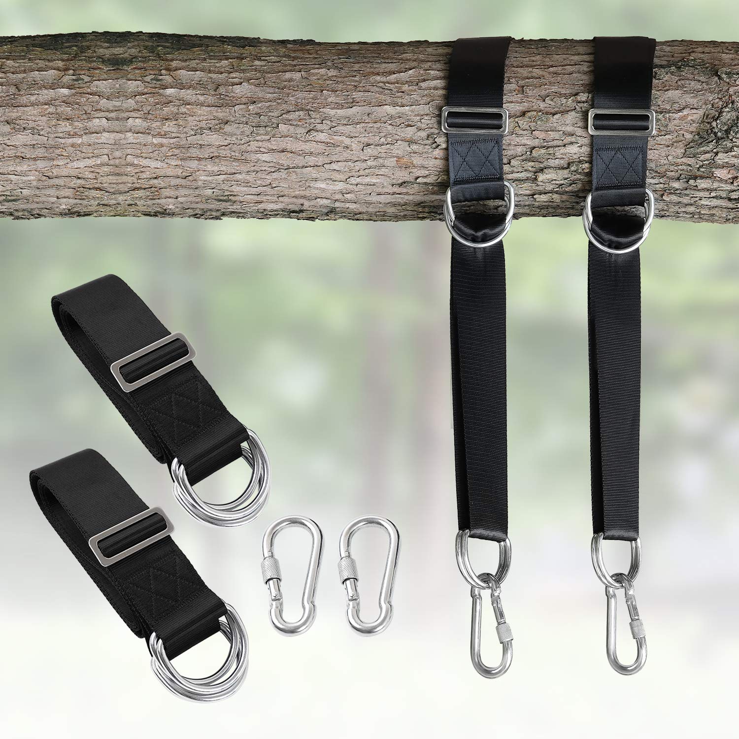 - A GIFT YOU NEED:These eco tree friendly straps are designed with all of the essentials included in this kit: a set of 2 extra tree swing straps,2 extra strong metal carabiners.perfect for Camping hammock,classic tree swings, garden swings, toddler swings, porch and patio swings,and even the very popular saucer swings