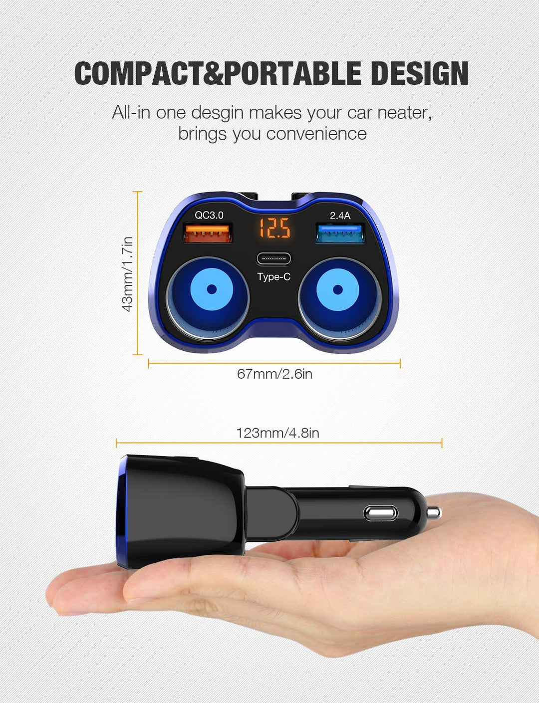 - Original Automobile Chargers – Car Charger, 150W 2-Socket Cigarette Lighter Splitter QC 3.0 Dual USB Ports 1 USB C Fast Car Adapter with Separate Switch LED Voltmeter Replaceable 15A Fuse for GPS/Dash Cam/Phone/iPad by Otium