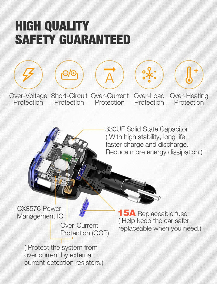 - More SurprisesAdditional high-quality 15A car charger fuse and a rubber ring are included with this USB cigarette lighter adapter. And there are 2 ways to use the rubber ring to effectively prevent the car charger from slipping.