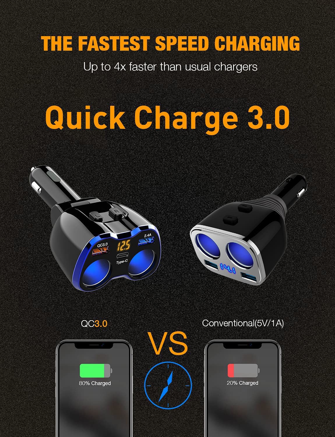 - QC3.0 Fast Charger & 5 in 1 Super Charger New upgraded Quick charge 3.0 port can charge mobile devices up to 80% in only 35 minutes which provides 4X FASTER CHARGING SPEED for compatible devices. 2.4A Smart IC USB port charges up to 2.5X faster than usual car chargers and a type c port enable you to rapidly charge two devices simultaneously. Two 12V/24V cigarette lighter sockets (maximum 120W for each socket) fit perfectly with your GPS, Dash Cam, Satnav, Satellite Radio, etc.