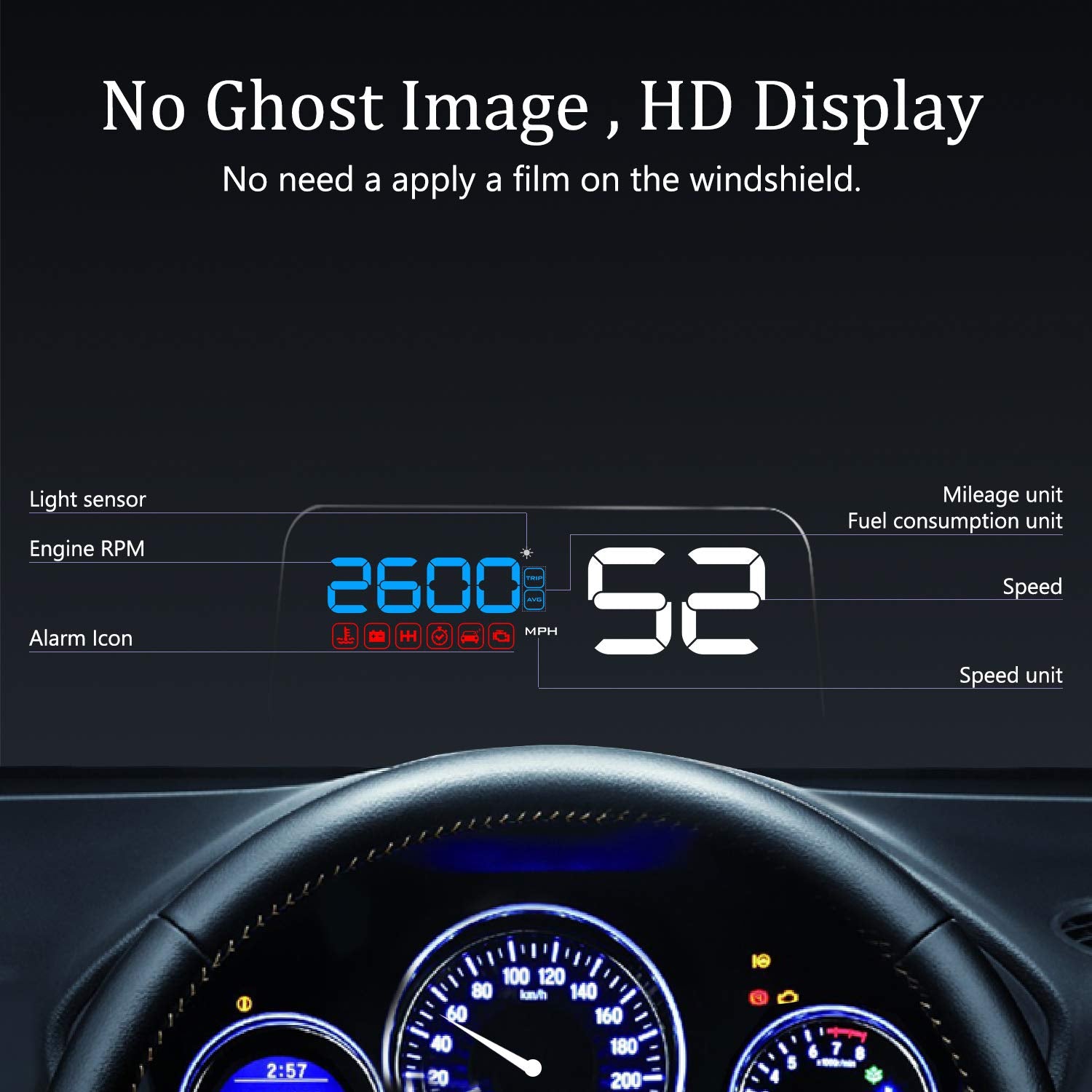 - vNO DOUBLE IMAGE:Using the high quality material glass with excellent reflectance and light transmittance,No double image.Built-in photosensitive component, which senses external light intensity and automatically adjusts HUD brightness to suit the environment,display the data clearly whether day or night.