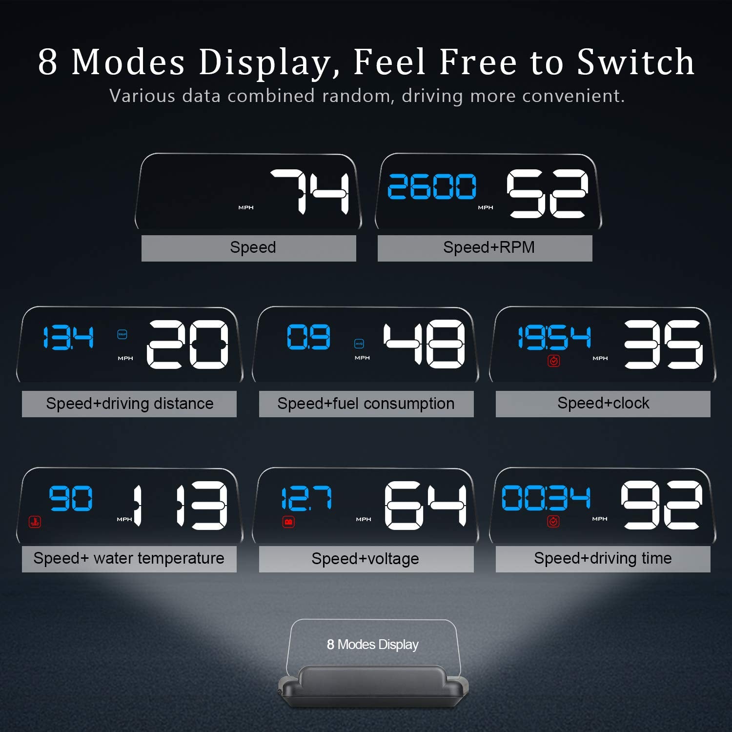 - vLOTS INFORMATION DISPLAY: Some main driving information can be displayed on this head up display screen,including speed,water temperature,voltage,fuel consumption,RPM,driving distance,driving time and clock.With the stereo projection,help you to see clearly while driving,just keep your eyes on the road.