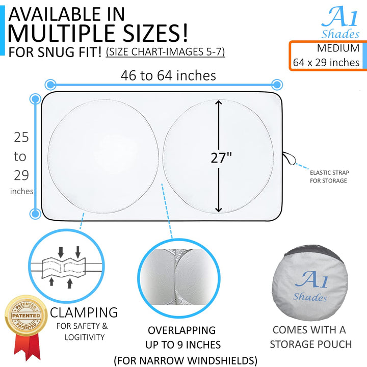 - Original Windshield Sunshades – Car Windshield Sun Shade with Storage Pouch by A1 Sunshade Retractable Automotive Car Truck SUV Front Window Shield Blocker Screen Visor Protector Cover for Auto Interior Accessories for Heat Medium by A1 Shades