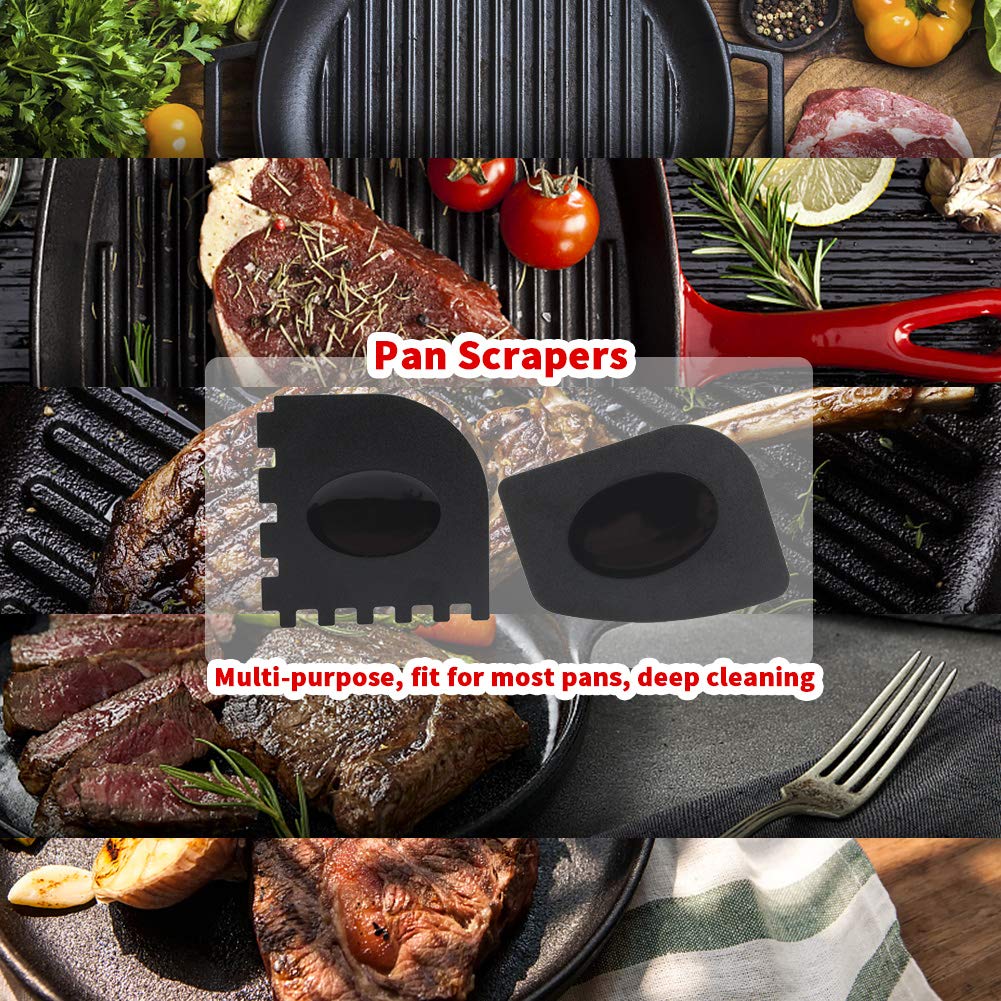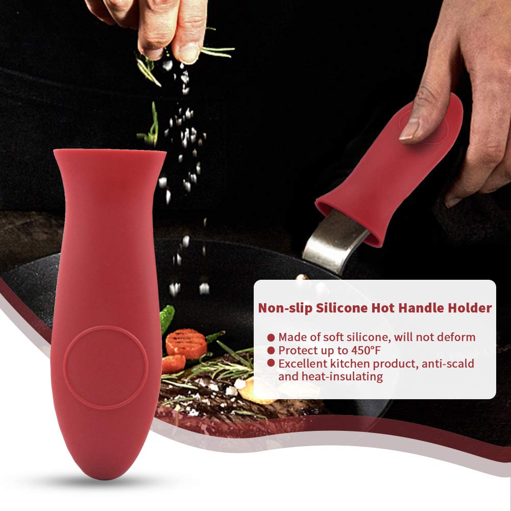 - Silicone Hot Handle Holder & Plastic Pan Scraper - High quality silica gel Handle with smooth and non-textured surface, easy to clean by hand, can withstand up to 450 degree Fahrenheit, providing a comfortable grip when handling hot cookware on the stove. Plastic pan scrapers, smooth and rust-proof, can scrape the most stubborn dirt and grease, reusable tools will not easily break or crack and won't shed or smell bad.