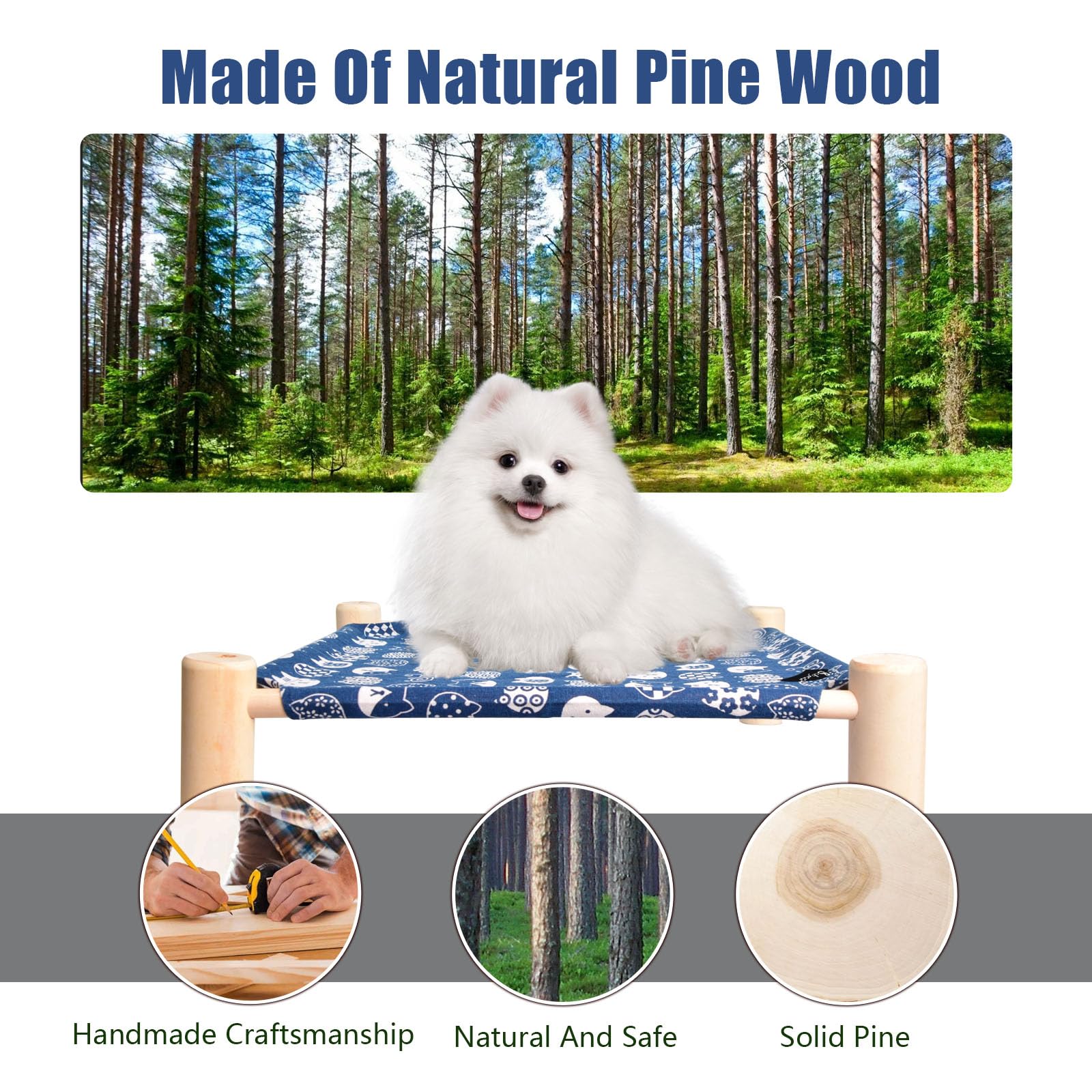 - [MATERIAL]: The pet hammock bed for cats and dogs is composed of linen fabric and natural wood frame, and small cat bed support rod is made of natural pine. The strong and sturdy frame can provide more stable support and prevent the bed from shaking or toppling over, and pine will make pets feel more secure, reduce their anxiety, and let them sleep better. The fabric is breathable and promotes air circulation, keeping the puppy/cat cool in hot weather.