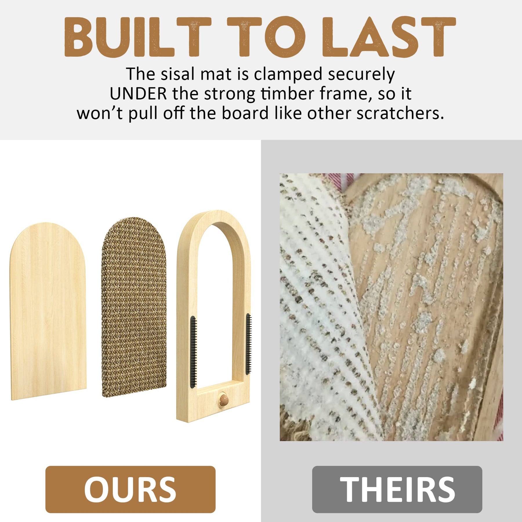 - SISAL MAT SECURED UNDER TIMBER FRAME - Safe & non toxic, the extra large sisal cat scratching mat is secured between 2 layers of natural timber. This ensures a safe scratch for your cat and also longevity of the cat scratcher. Other scratchers have their sisal mat only glued to the timber which pulls off easily and causes stress to cats. 23”L x 11” W x .9” H PATENT PENDING