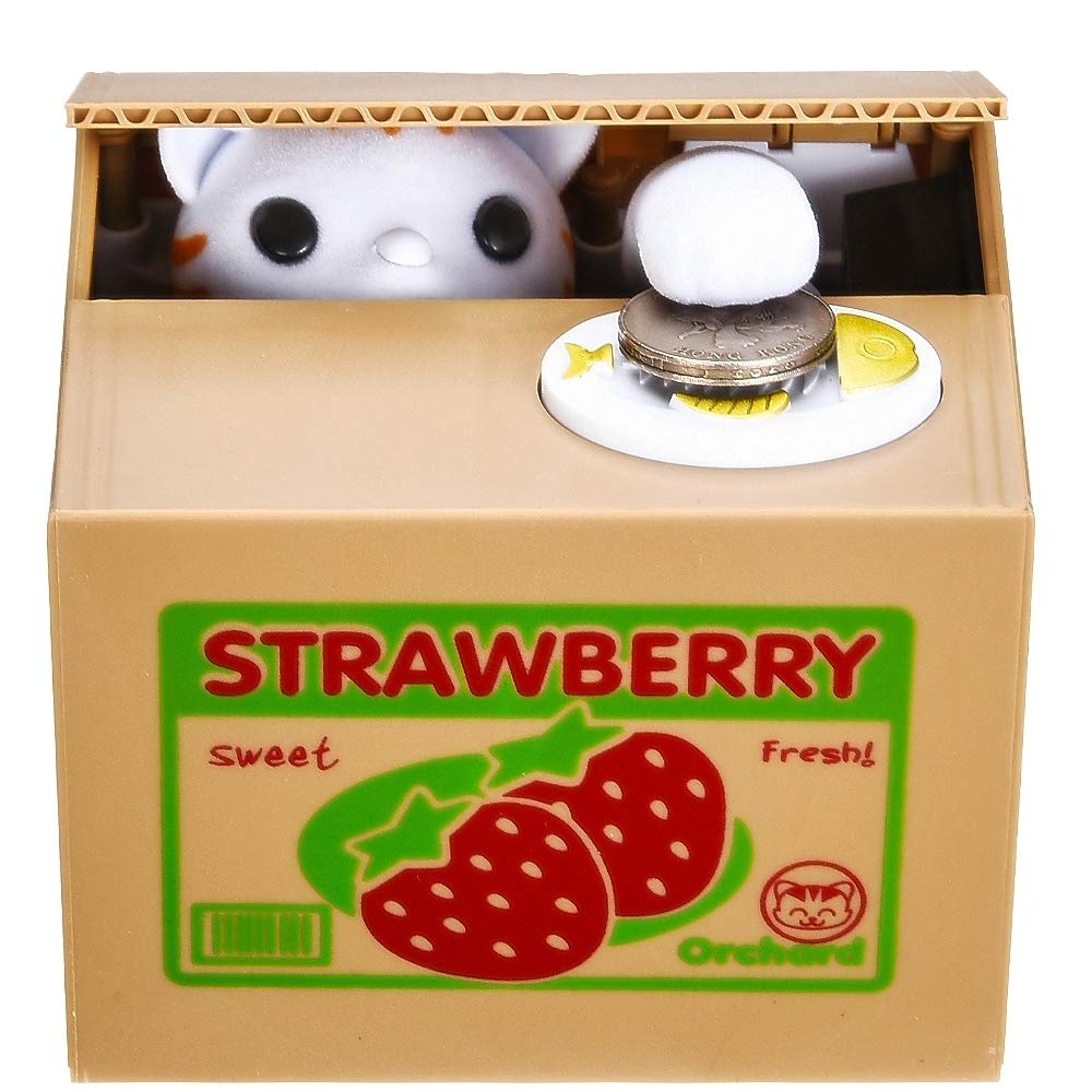 Adorable mechanical kitty comes out of cardboard box to steal your coins to help you save money.
