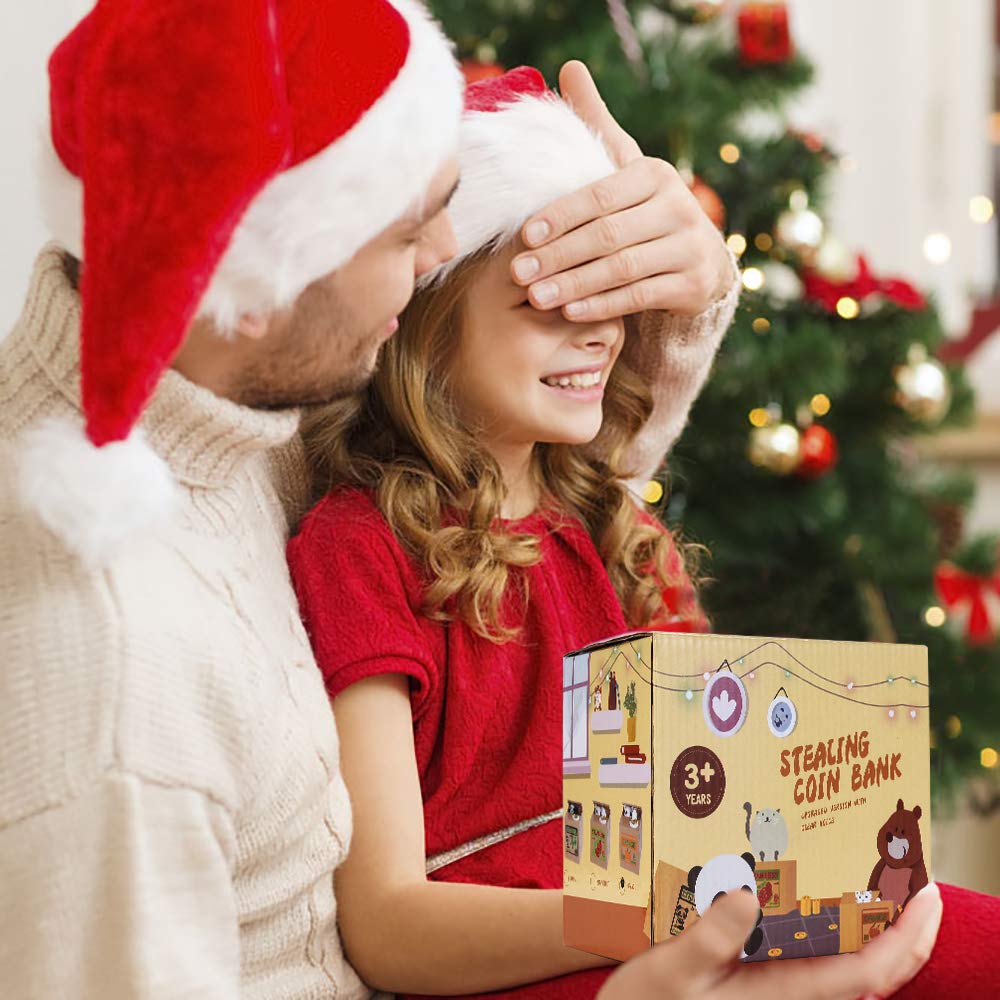 - Cute cat or panda of this coin stealing piggy bank will come out of cardboard box and grab your coins