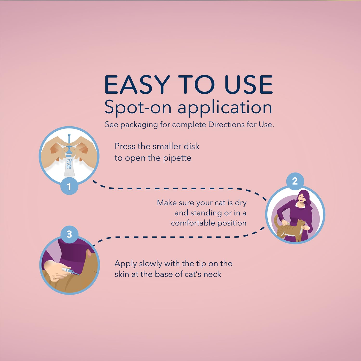 | directions | HOW TO APPLY: 1. Ensure your cat is dry before applying the product, and ensure your cat remains dry for 24 hours after application. The cat should be standing or in a comfortable position for easy application. 2. Remove the tube from the package. 3. Holding the tube upright, pointing away from you and your cat’s face, place your thumb and index finger around the applicator tip above the small disk. With the other hand, grasp the stem of the applicator tip under the large disk. Press down firmly on the small disk until both disks meet, piercing the seal. 4. Part the hair down to the level of the skin and slowly apply the product at the base of the cat or kitten’s head until the tube is completely empty. Avoid superficial application to the cat’s hair. Do not get the product in your cat’s eyes or mouth. 5. Discard the empty tube as outlined in the Storage and Disposal section. 6. Repeat every month. 7. For optimal treatment, control and prevention of adult fleas, flea eggs, flea larvae ticks and chewing lice, year-round monthly application is recommended. Read the package insert for complete product information. |