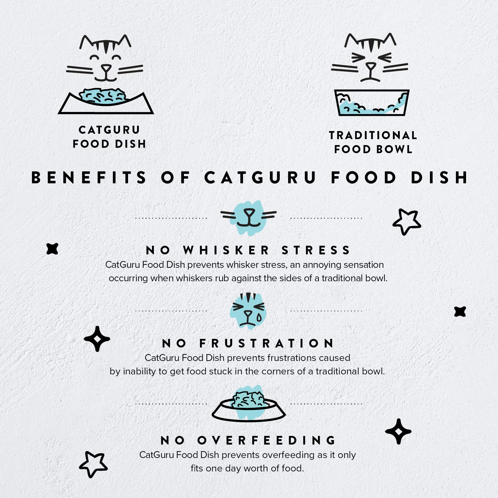 - EASY TO USE. These pet bowls for cats are more durable than ceramic cat bowls. They do not make as much noise as stainless steel cat dishes and do not absorb smell like plastic pet bowls. Dishwasher safe. Do not microwave. For best results use with CatGuru cat food mat tray.
