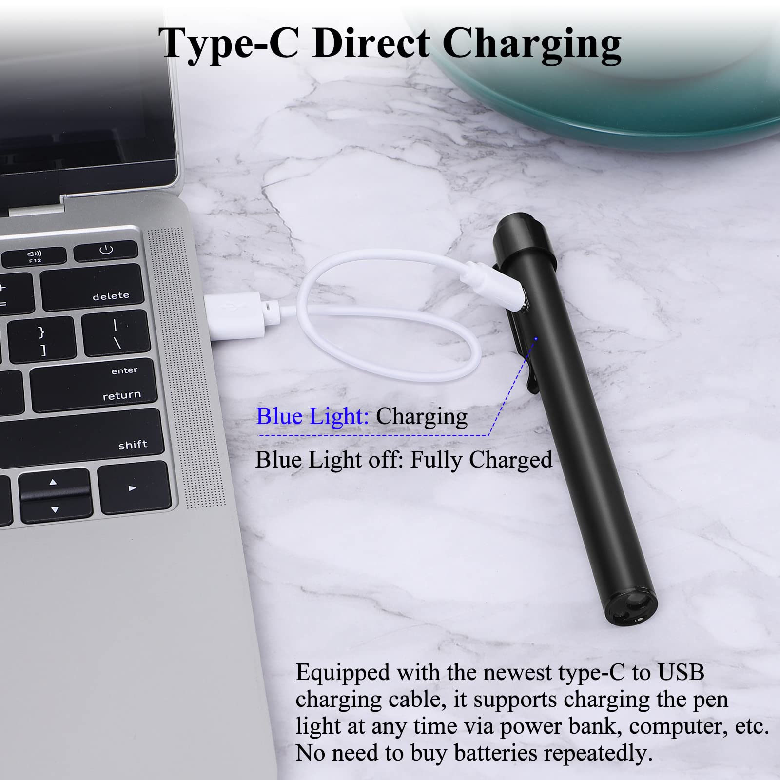 - Rechargeable DesignThis pen light is designed with a built-in rechargeable battery. We equipped with the newest type-C to USB charging cable and you can charge the pen light at any time via power bank, computer, etc. It will save your money to buy batteries repeatedly.